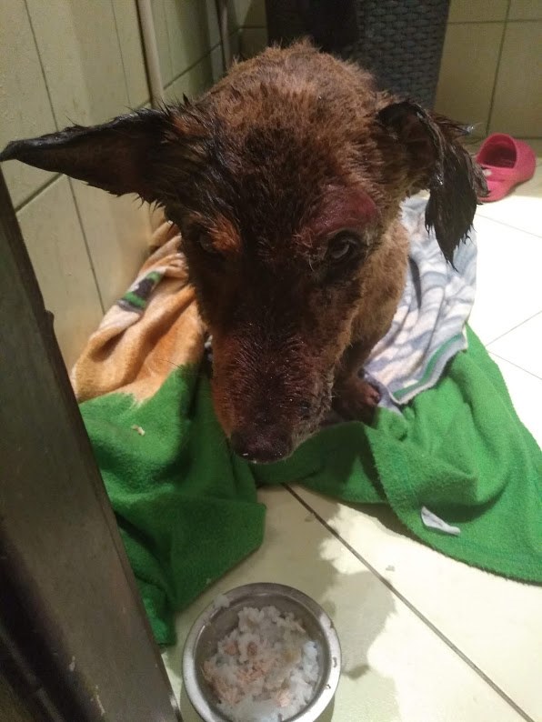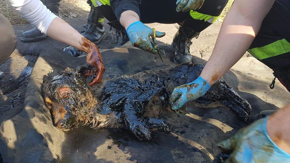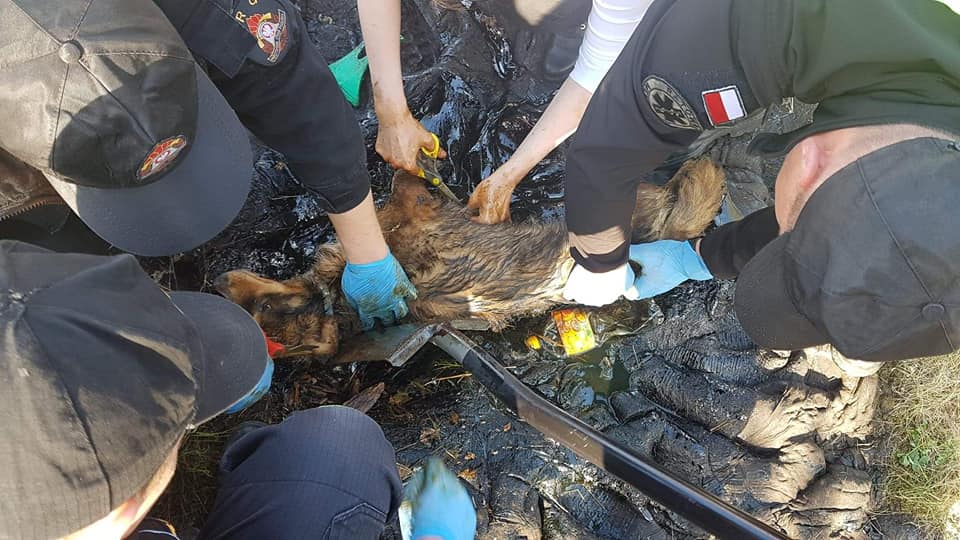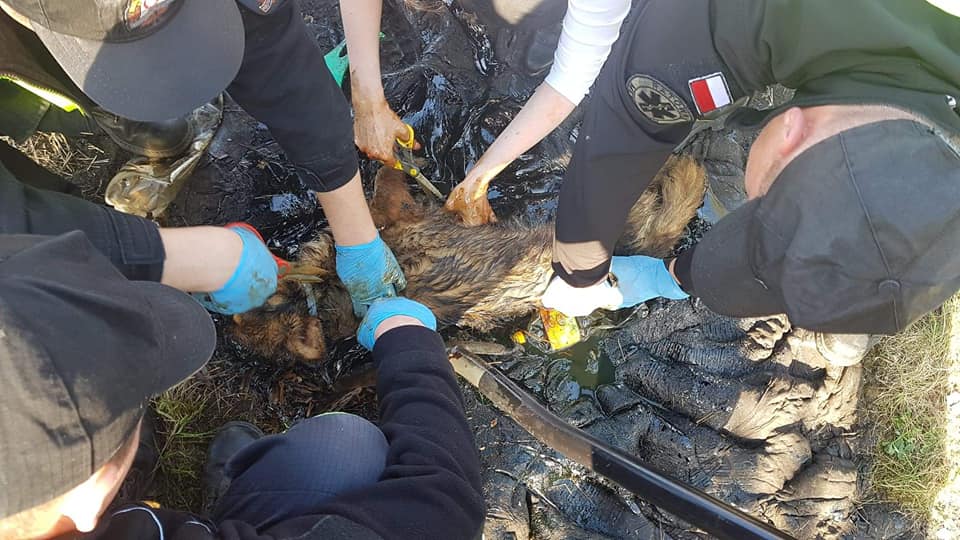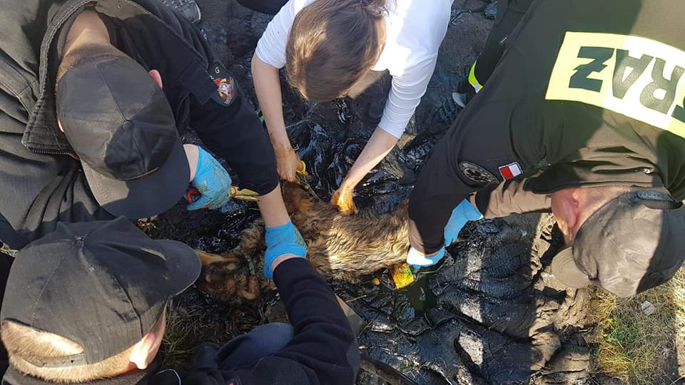 - Nasza wolontariuszka pojechała na miejsce. Pies żyje!!! Po chwili zadzwoniła na straż pożarną. Nie czekając na pomoc wraz z Karoliną, zaczęły same działać. Smarować psa olejem i po centymetrze odklejały. Przyjechała policja, wezwała raz jeszcze straż pożarną. Akcja ratunkowa trwała około godziny. Dziękujemy za pomoc straży, policjantom oraz wszystkim ludziom o wielkich sercach, którzy ruszyli do działania! Jak długo tam leżał? Dlaczego się tam znalazł? Na to pewnie nie poznamy odpowiedzi... Najważniejsze, że psiak żyje, oko nie jest uszkodzone... - informuje Fundacja.