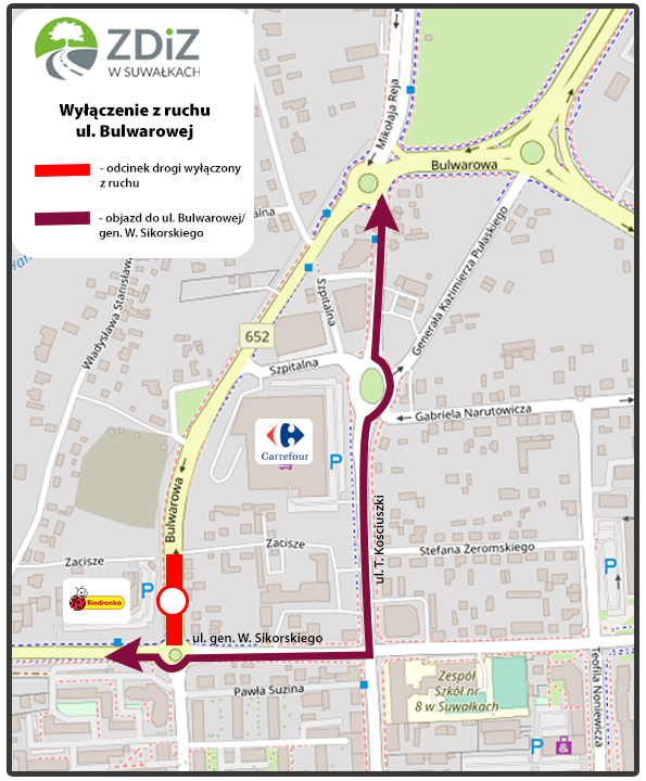 Zarząd Dróg i Zieleni w Suwałkach informuje, że w związku z rozbudową ul. E. Plater, ul. gen. W. Sikorskiego oraz Ronda Polskiej Organizacji Wojskowej w Suwałkach, od środy, 20 września zostanie wyłączona z ruchu ul. Bulwarowa (na odcinku od Ronda Polskiej Organizacji Wojskowej do skrzyżowania z ul. Zacisze), z możliwością dojazdu do posesji oraz obiektów, w których prowadzona jest działalność gospodarcza.