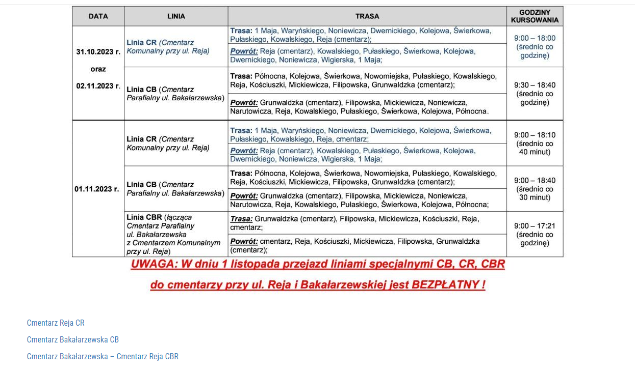 We wtorek, 31 października, w środę, 1 listopada i w czwartek, 2 listopada Zakład Komunikacji Miejskiej PGK uruchamia specjalne linie autobusowe na cmentarze przy ul. Bakałarzewskiej oraz przy ul. Reja. W Dzień Wszystkich Świętych można skorzystać z nich za darmo.