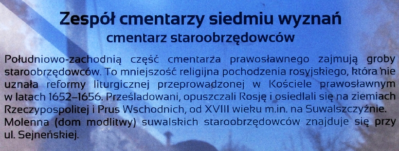Gmina Wynaniowa w Suwałkach Wschodniego Kościoła Staroobrzędowego wystąpiła do ks. Łukasza Ławreszuka, proboszcza Parafii Prawosławnej pw. Wszystkich Świętych z prośbą „o rozważenie przekazania użytkowanego od stuleci Cmentarza Staroobrzędowego wraz z nieodpłatną służebnością drogi wewnętrznej cmentarza na rzecz Gminy.” W piśmie jest też mowa „o naruszeniu procedur k.p.a przy przekazaniu cmentarza przez wojewodę podlaskiego, wynikających z braku wiedzy o prawnym użytkowniku cmentarza”, a także ukryciu przez Kościół Prawosławny, drugiego użytkownika cmentarza w chwili dokonywania wpisu do Księgi Wieczystej.