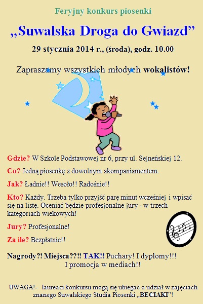 Konkurs dla młodych wokalistów odbędzie się w najbliższą środę w Szkole Podstawowej nr 6 w Suwałkach, przy ul. Sejneńskiej 12. Początek o 10.00. Wystarczy przygotować jedną piosenkę z dowolnym akompaniamentem, przyjść przed 10.00 i zapisać się na listę uczestników.