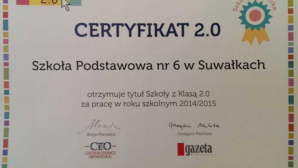 Szkoła Podstawowa nr 6 im. Aleksandry Kujałowicz w Suwałkach otrzymała - jako jedyna „podstawówka” z województwa podlaskiego - prestiżowy tytuł i certyfikat „Szkoły z Klasą 2.0”.