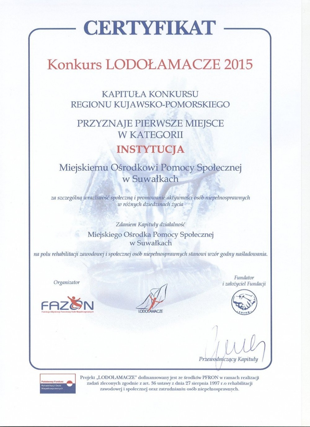 Miejski Ośrodek Pomocy Społecznej w Suwałkach został laureatem dziesiątej edycji Konkursu „Lodołamacze”. To prestiżowy konkurs dla firm i instytucji, które angażują się w rozwiązywanie problemów osób niepełnosprawnych.