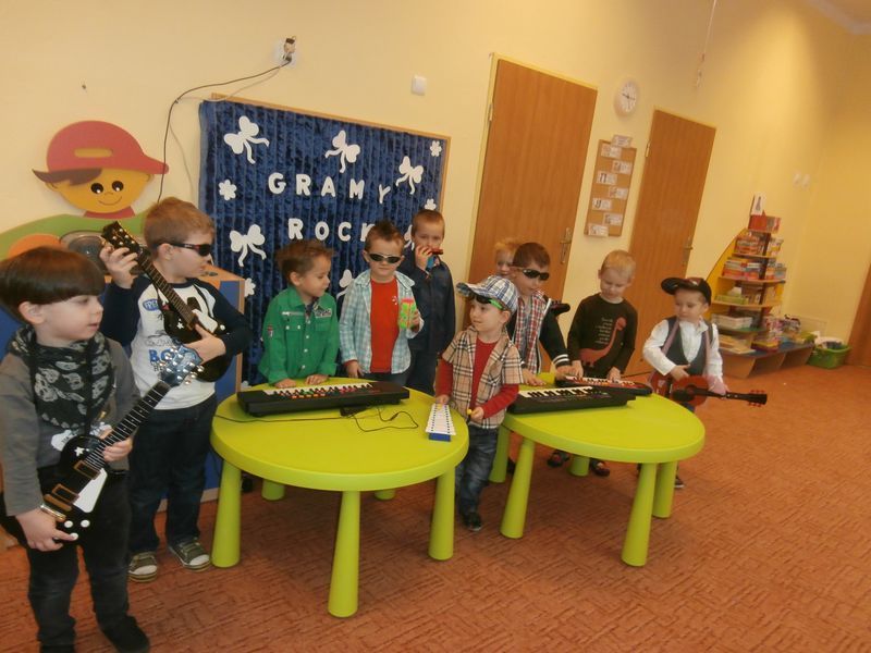 - ,,Gramy rocka”- koncert muzyczny, zorganizowany przez chłopców z grupy 4- latków dla koleżanek z przedszkola był wspaniałym widowiskiem, pełnym radości i niezapomnianych wrażeń. Dziewczynki poczuły się bardzo lubiane i szanowane przez swoich kolegów. Chłopcy zaprezentowali duże umiejętności wokalne, muzyczne i taneczne. Owacjom nie było końca. Koncert zakończył się gromkimi brawami oraz rozdaniem autografów małych artystów.