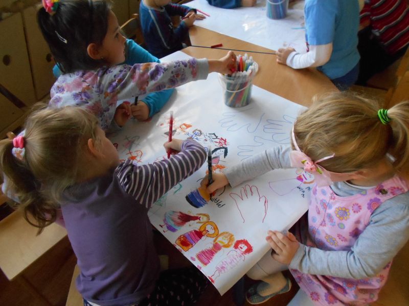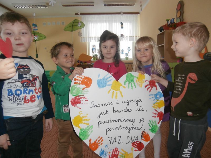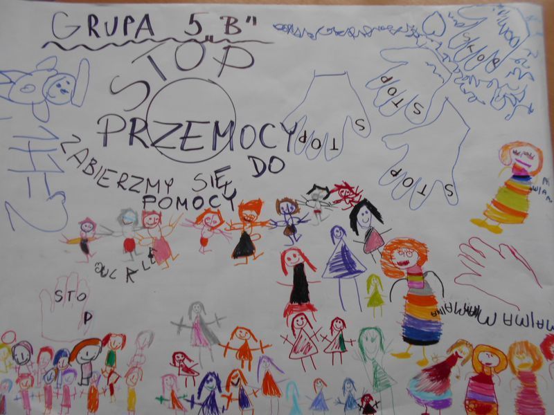 - „Mój tata wobec kobiet jest…”- wywiad przeprowadzony przez nauczycielkę wśród dzieci sześcioletnich Nasze przedszkolaki chętnie włączyły się w zabawę, pokazując tym samym, iż doskonale wiedzą jak kobiety powinny być traktowane przez mężczyzn. Dzieci podczas rozmowy wskazywały przede wszystkim na takie cechy jak: uprzejmość, uczciwość, chęć pomagania innym, wrażliwość, empatię , obowiązkowość, opiekuńczość, uczynność, troskliwość, poczucie humoru, okazywanie szacunku innym, łagodność, spokój i opanowanie, serdeczność, czułość itp. Dodatkowo sześciolatki wykonały pracę plastyczną pt. „Przyjaźni start, agresji stop”, która także jest odzwierciedleniem wiedzy, jaką posiadają dzieci na temat przemocy.