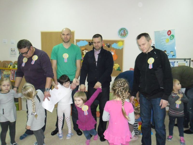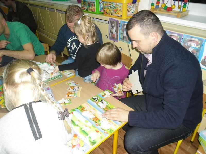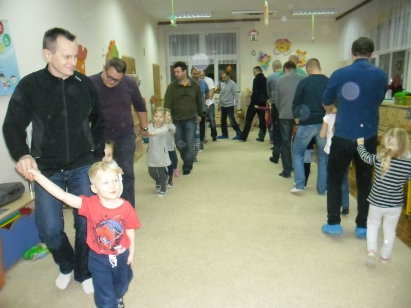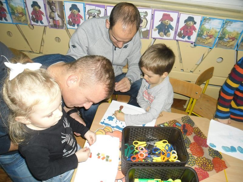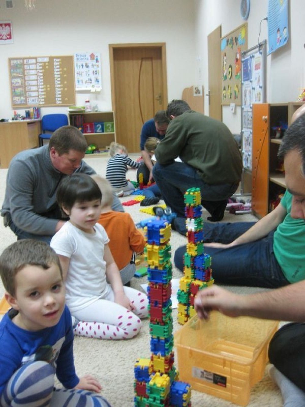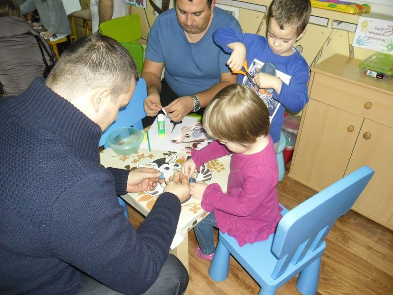 - ,,Aktywny tata – jak spędzać czas z dzieckiem? - w grupie 3-4 latków odbyły się zajęcia, w których wzięły udział dzieci razem z tatusiami. Celem tych zajęć było wzmacnianie więzi między dziećmi a ojcami, budowanie i podtrzymywanie właściwych relacji rodzinnych poprzez wspólne spędzanie czasu wolnego. Nauczycielki zaprosiły wszystkich do zabawy i podróży pociągiem po sali. Pierwszą stacją były zajęcia ruchowe, które prowadziła jedna z mam. Kolejną stacją było układanie puzzli i układanek. Następnie pociąg zatrzymał się przy stacji plastycznej. Przedszkolaki wspólnie z ojcami mogły rysować, malować, wycinać przyklejać, odrysowywać a także lepić z plasteliny. Na stacji w bibliotece dzieci mogły posłuchać wybranych książek czytanych przez ojców. Ostatnią stacją było budowanie najwyższej wieży z klocków. Na zakończenie dzieci wręczyły swoim tatusiom odznakę „Tata na medal”.