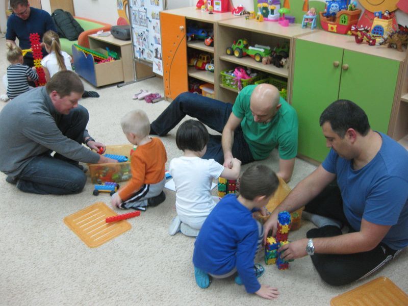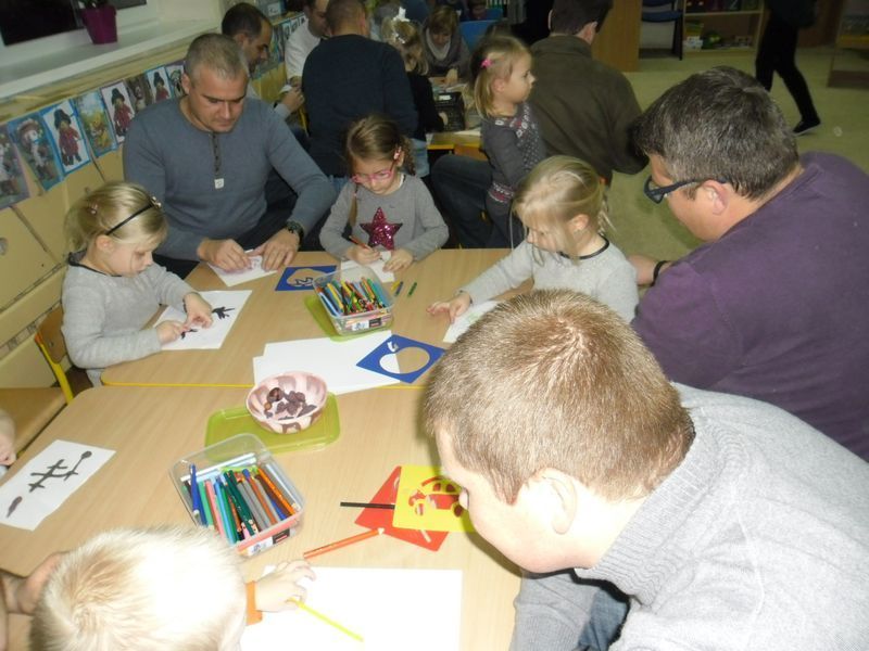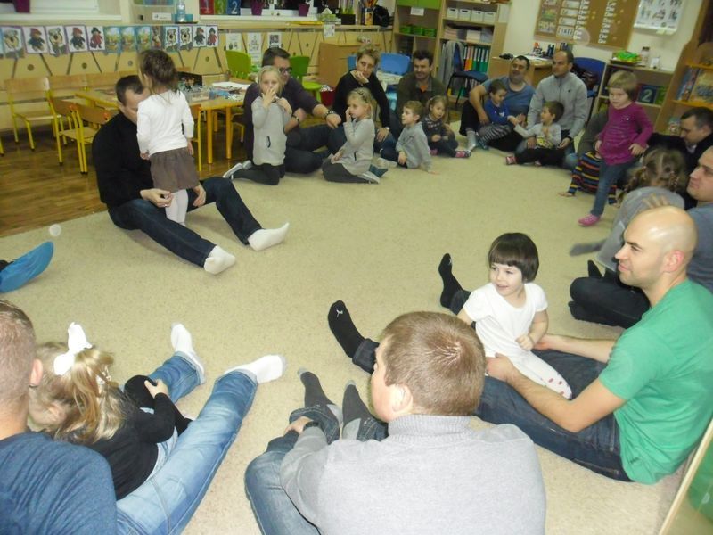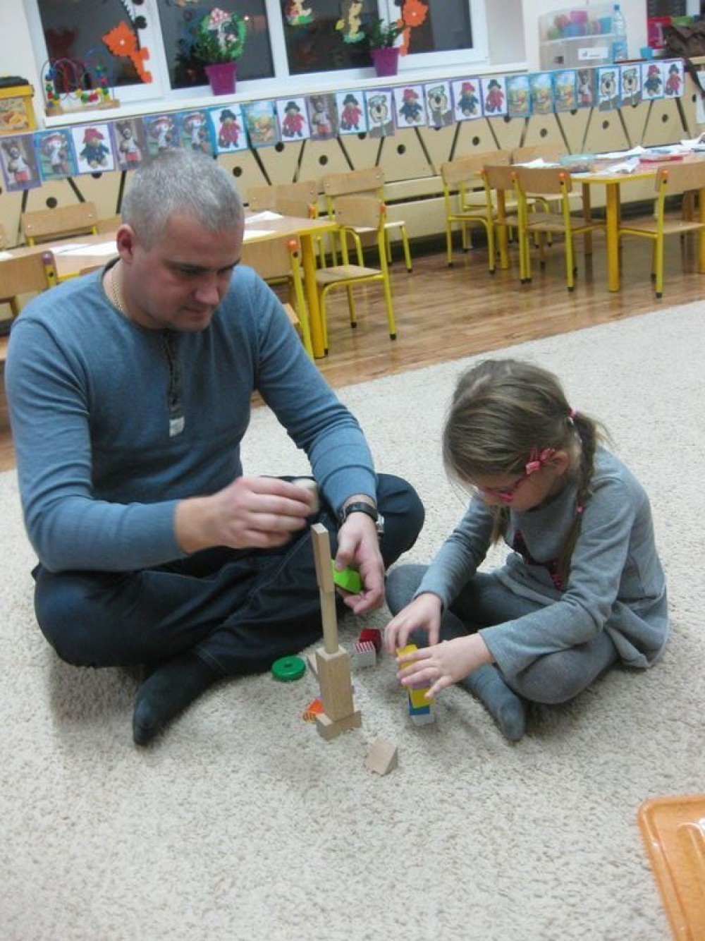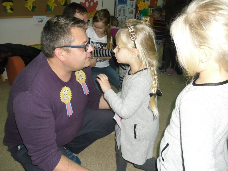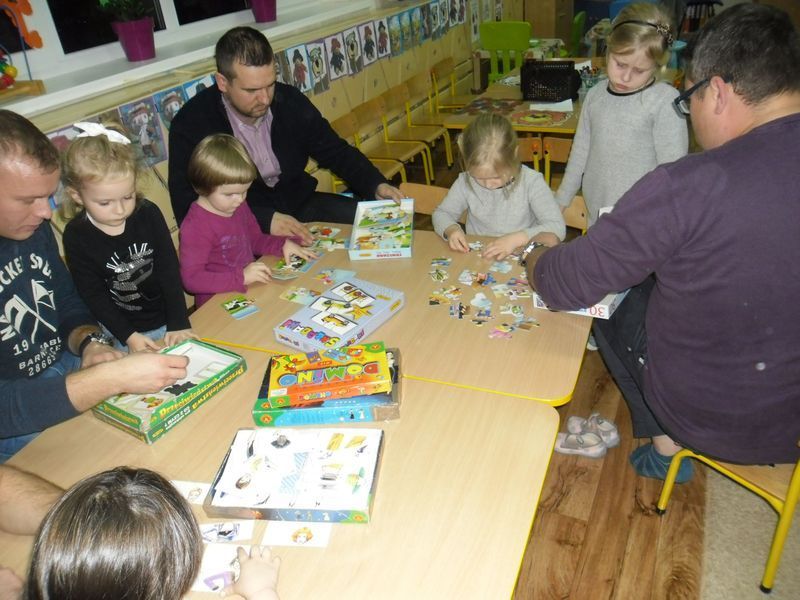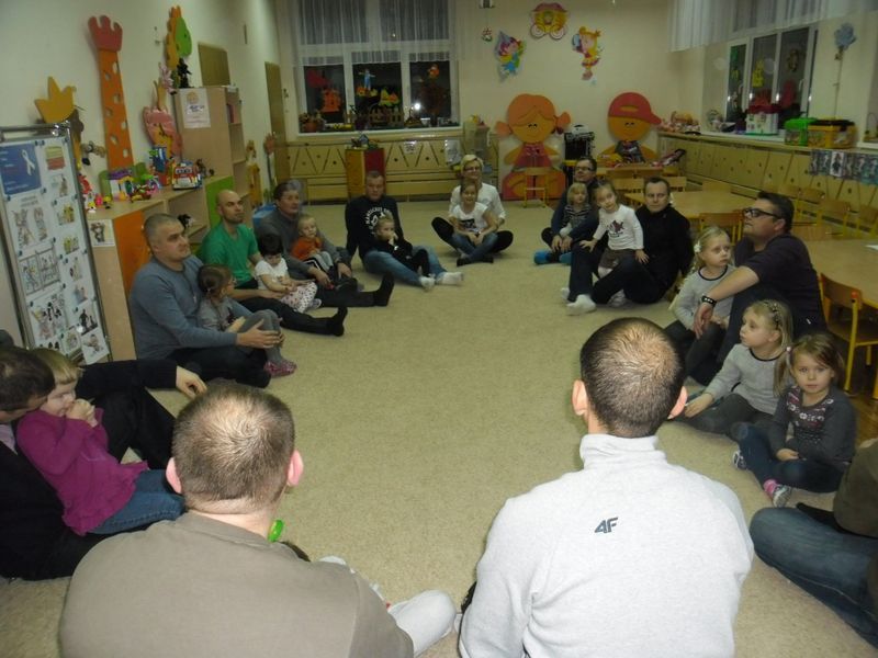 - ,,Aktywny tata – jak spędzać czas z dzieckiem? - w grupie 3-4 latków odbyły się zajęcia, w których wzięły udział dzieci razem z tatusiami. Celem tych zajęć było wzmacnianie więzi między dziećmi a ojcami, budowanie i podtrzymywanie właściwych relacji rodzinnych poprzez wspólne spędzanie czasu wolnego. Nauczycielki zaprosiły wszystkich do zabawy i podróży pociągiem po sali. Pierwszą stacją były zajęcia ruchowe, które prowadziła jedna z mam. Kolejną stacją było układanie puzzli i układanek. Następnie pociąg zatrzymał się przy stacji plastycznej. Przedszkolaki wspólnie z ojcami mogły rysować, malować, wycinać przyklejać, odrysowywać a także lepić z plasteliny. Na stacji w bibliotece dzieci mogły posłuchać wybranych książek czytanych przez ojców. Ostatnią stacją było budowanie najwyższej wieży z klocków. Na zakończenie dzieci wręczyły swoim tatusiom odznakę „Tata na medal”.