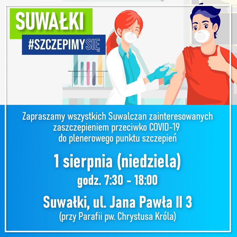 Dodatkowy punkt szczepień przy Parafii Rzymskokatolickiej pw. Chrystusa Króla przy ul. Papieża Jana Pawła II 3 w Suwałkach otwarty będzie w godzinach 7:30 - 18:00.
