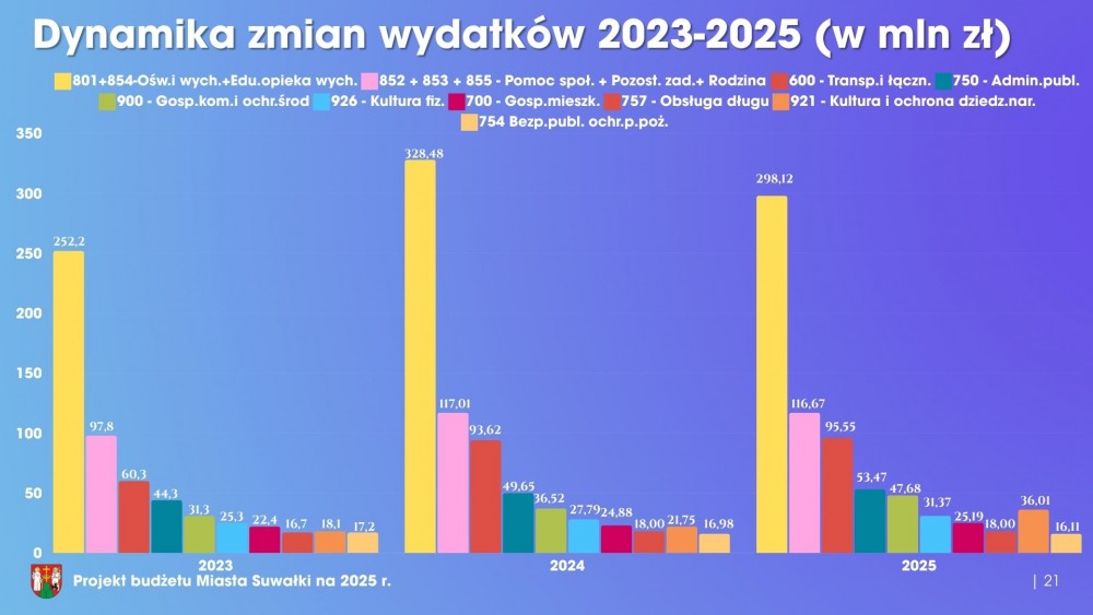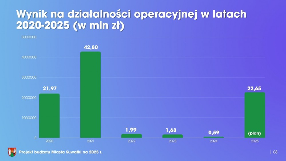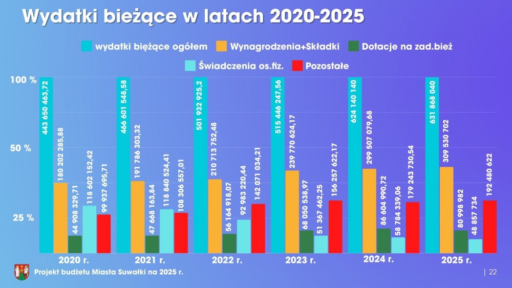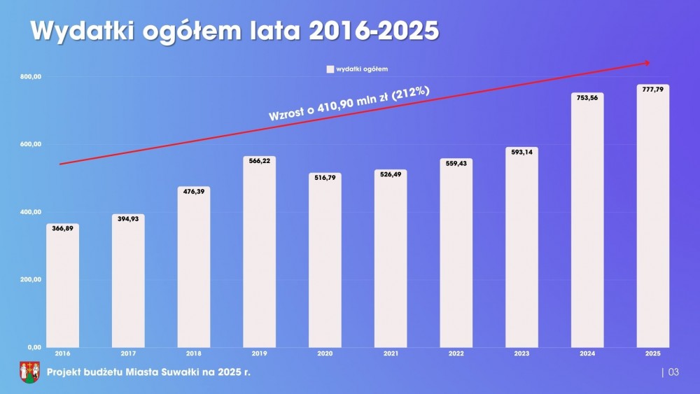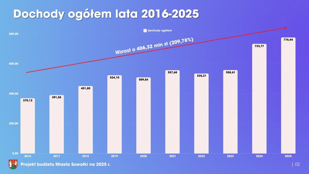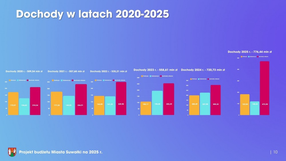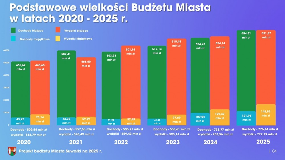 Cztery lata temu suwalscy radni uchwalali plan dochodów i wydatków na poziomie 500 mln zł. Inflacja, wzrost kosztów i płac robią swoje. W miniony piątek przyjęli budżet na 2025 rok o ćwierć miliarda wyższy, w którym dochody mają wynieść 776 mln 440 tys. zł, a wydatki 777 mln 794 tys. zł.