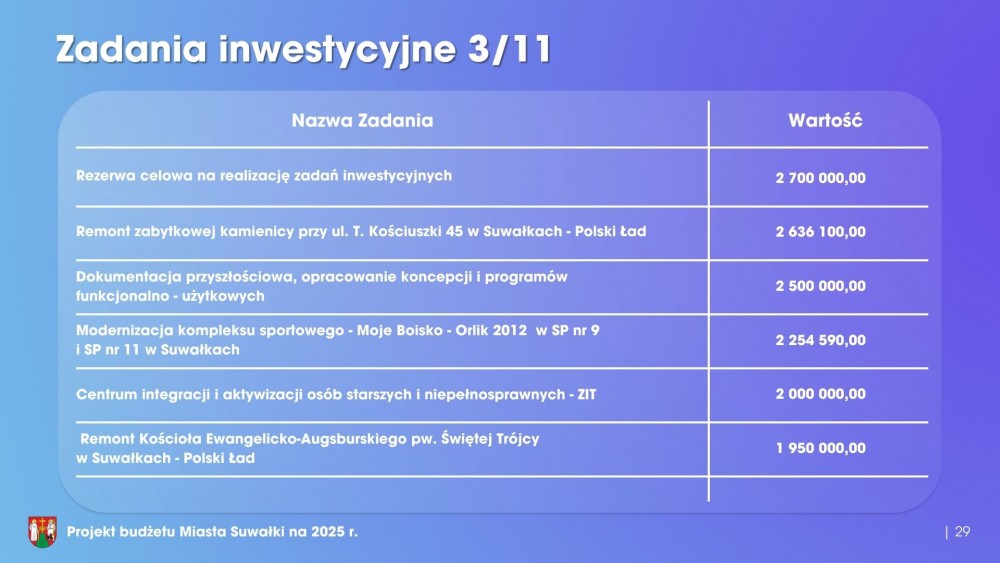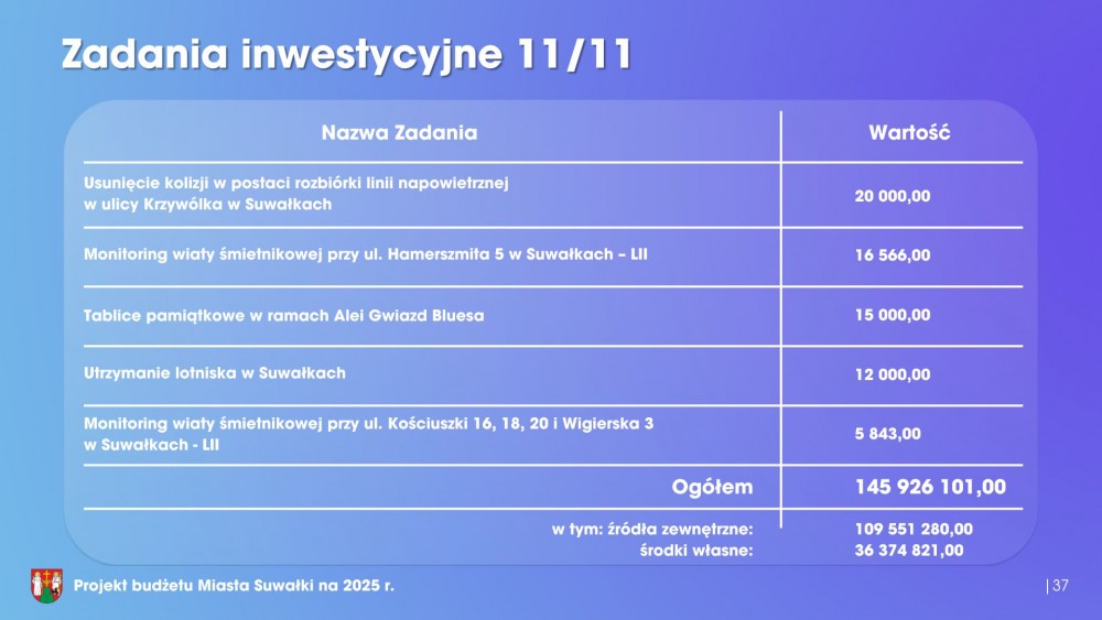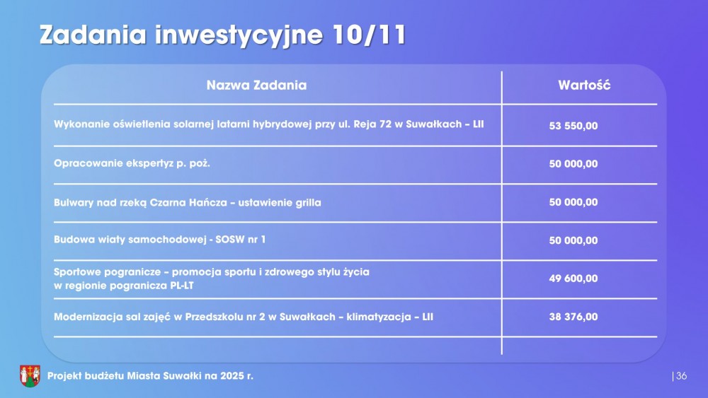 - To budżet dobry, zrównoważony, zbilansowany. To też budżet rekordowy i proinwestycyjny. Budżet nie zakÅ‚ada wzrostu zadÅ‚użenia miasta. ZaÅ‚ożyliÅ›my też podwyżki wynagrodzeÅ„ dla pracowników zarabiajÄ…cych najniższÄ… krajowÄ… ale też i dla tych, którzy zarabiajÄ… wiÄ™cej. Na podwyżki mogÄ… też liczyć nauczyciele – powiedziaÅ‚ przed gÅ‚osowaniem Radnych CzesÅ‚aw Renkiewicz, prezydent SuwaÅ‚k – To również rekordowy budżet pod kÄ…tem dochodów majÄ…tkowych, które wynoszÄ… prawie 122 mln zÅ‚. W sumie ze Å›rodkami wÅ‚asnymi chcemy zainwestować ponad 146 mln zÅ‚. Aplikujemy skutecznie o Å›rodki z Unii Europejskiej, których bÄ™dzie w przyszÅ‚ym roku ponad 100 mln zÅ‚. To olbrzymia praca i zasÅ‚uga WydziaÅ‚u Rozwoju i Funduszy ZewnÄ™trznych – dodaÅ‚ prezydent SuwaÅ‚k.