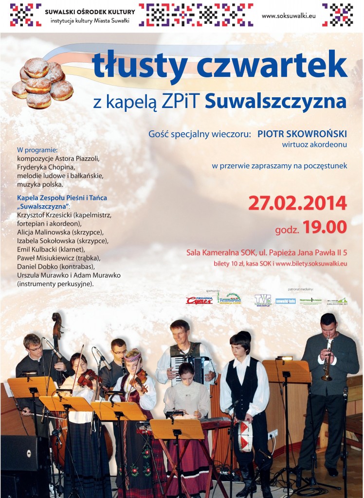 Tłusty czwartek z Kapelą ZPiT „Suwalszczyzna” w sali kameralnej SOK, przy ul. Papieża Jana Pawła II 5. Początek 19:00. Bilety: 10 zł w kasie SOK i na www.bilety.soksuwalki.eu