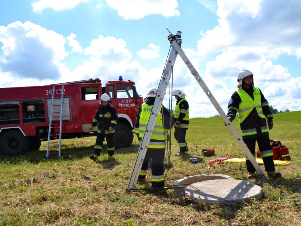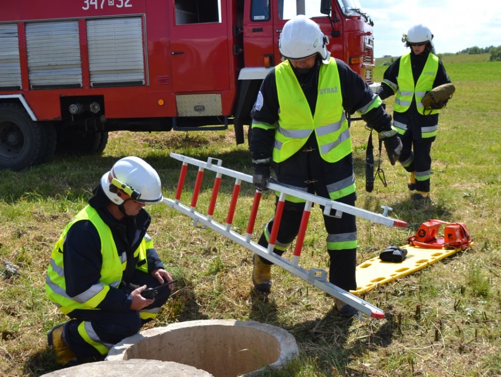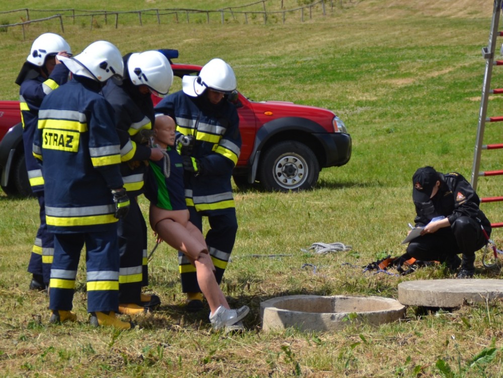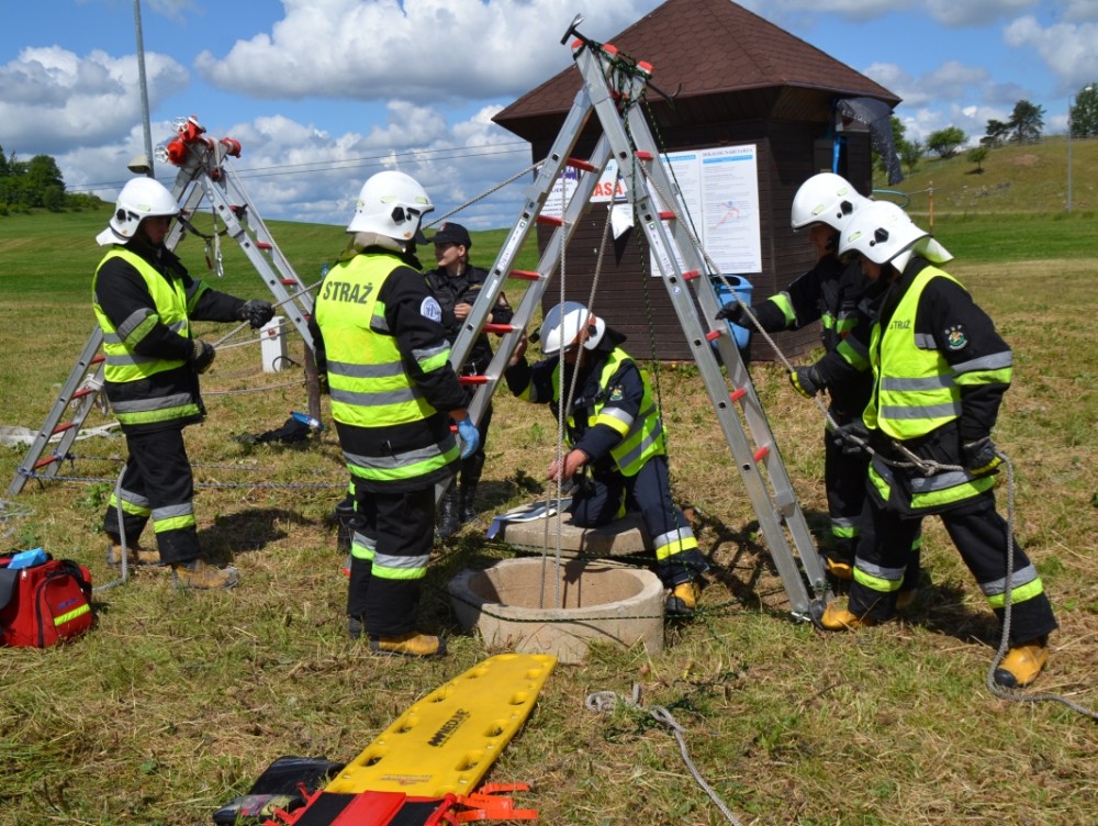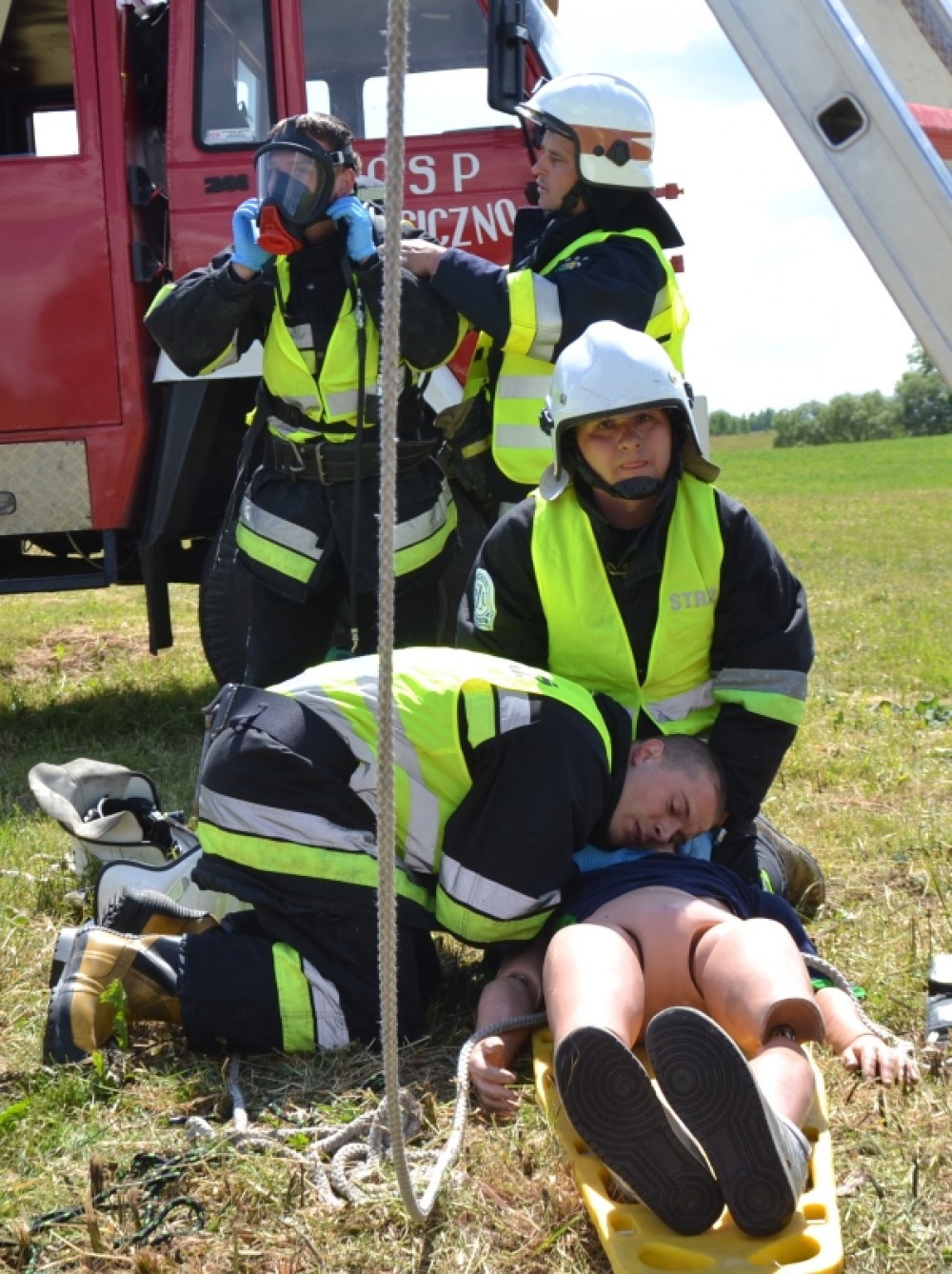 Druhowie zaczynają składać rusztowanie z dwóch drabin i obwiązują je linami. Kilka metrów dalej organizatorzy manewrów ustawili przykładową konstrukcję. Po chwili podobna stoi już nad studnią. Ktoś przypomina o aparacie tlenowym. Ktoś pokazuje jak mocno zawiązać sznur. Podpięty strażak znika między kręgami.