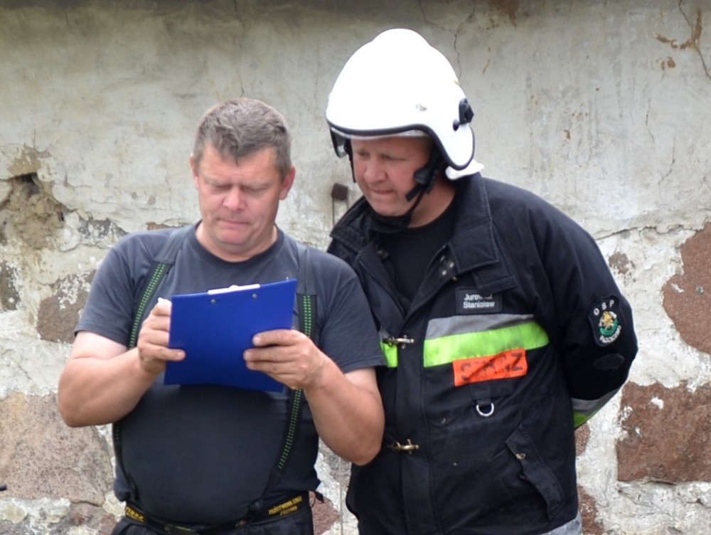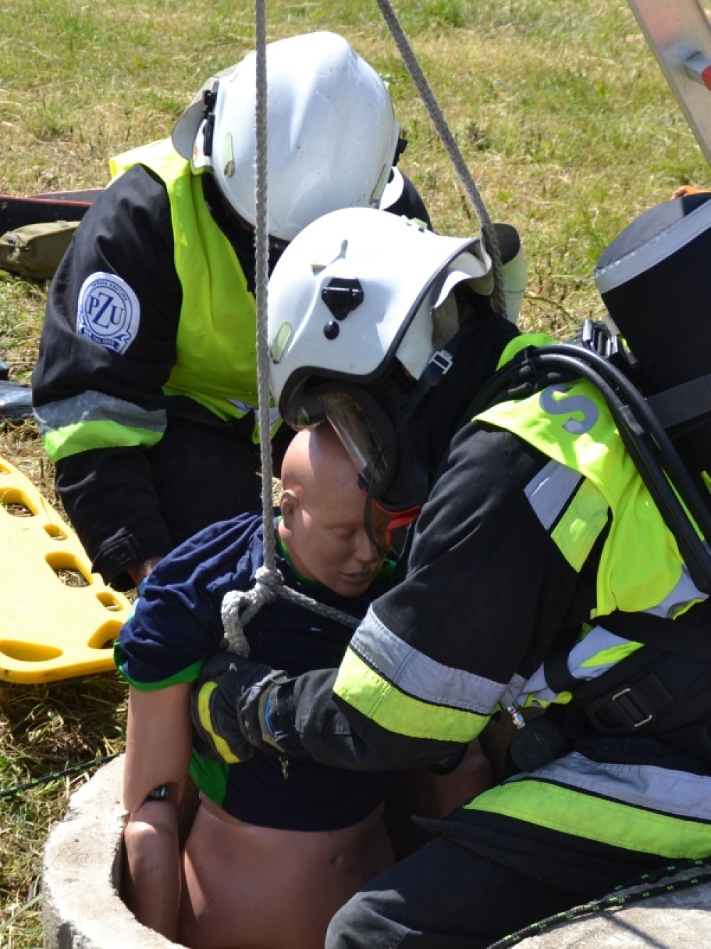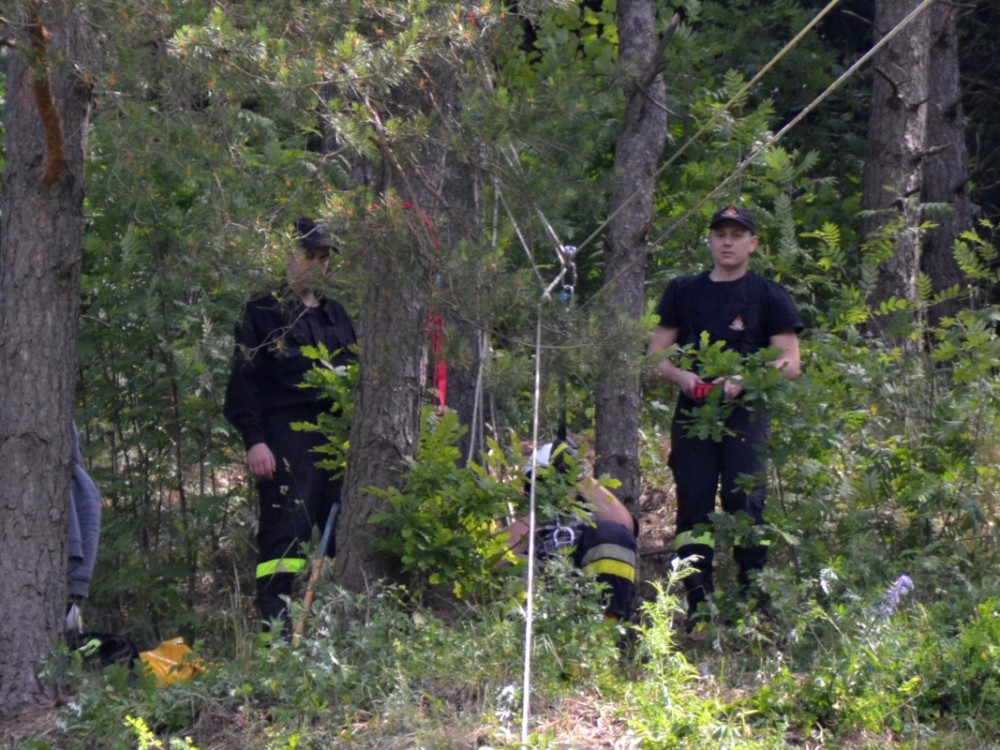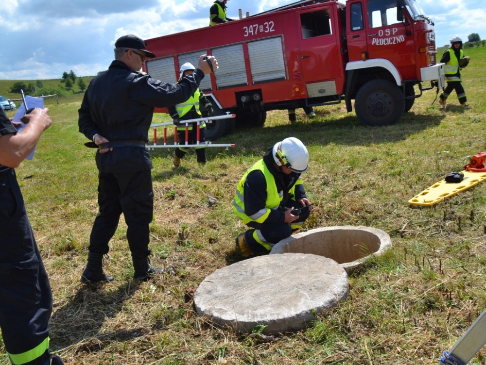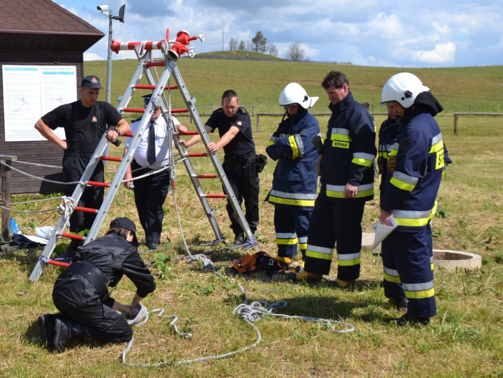 Druhowie zaczynają składać rusztowanie z dwóch drabin i obwiązują je linami. Kilka metrów dalej organizatorzy manewrów ustawili przykładową konstrukcję. Po chwili podobna stoi już nad studnią. Ktoś przypomina o aparacie tlenowym. Ktoś pokazuje jak mocno zawiązać sznur. Podpięty strażak znika między kręgami.