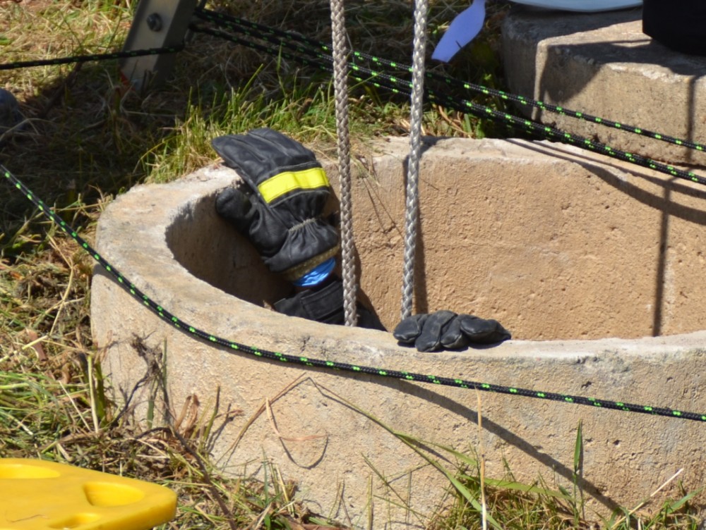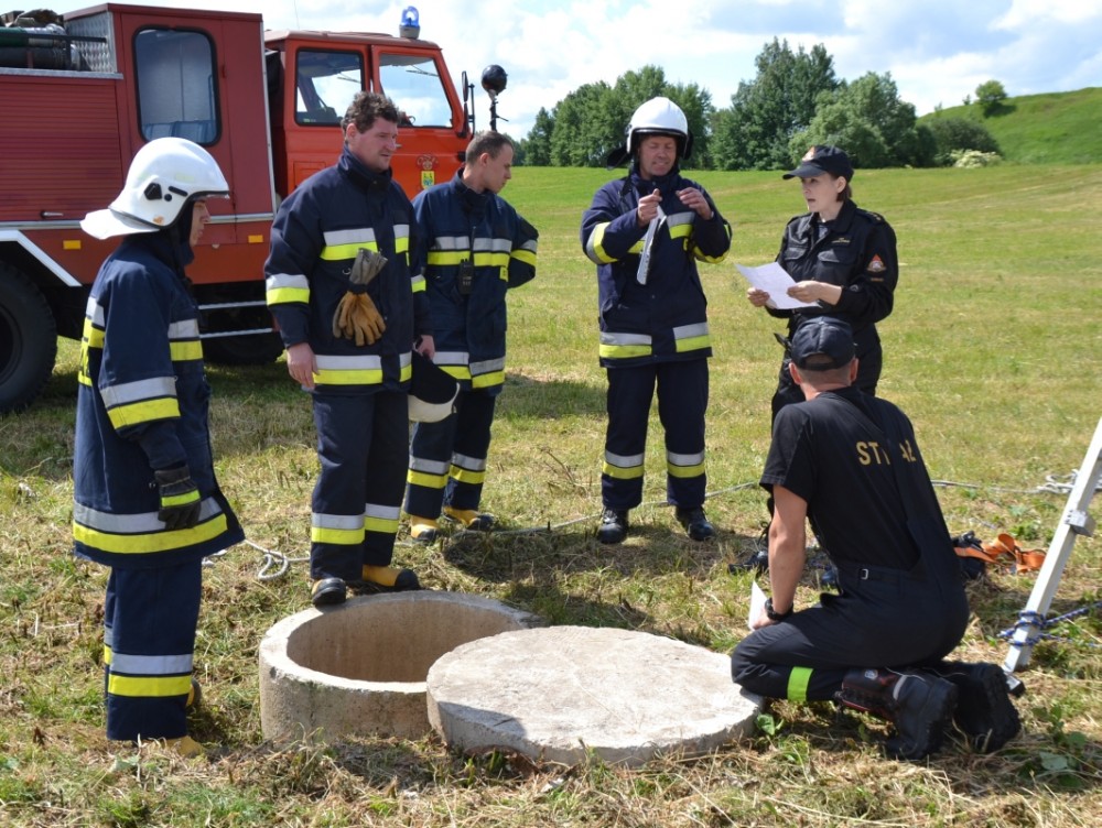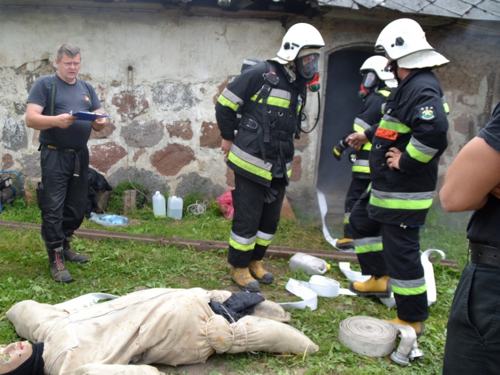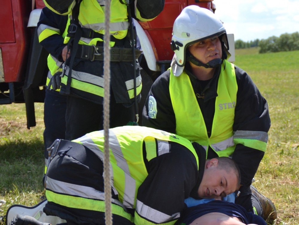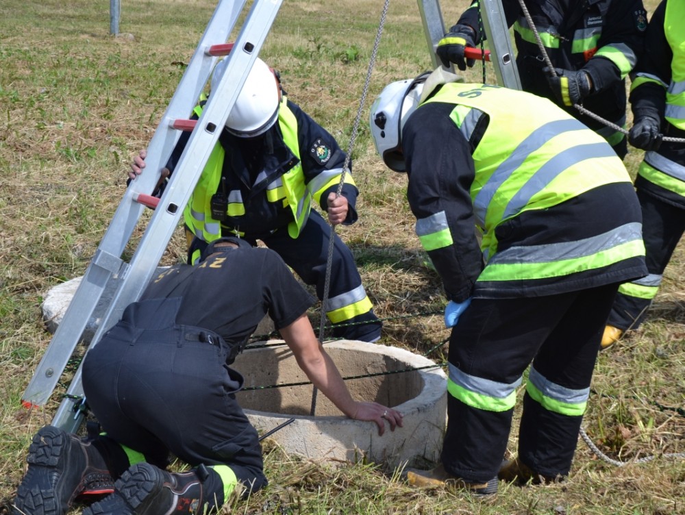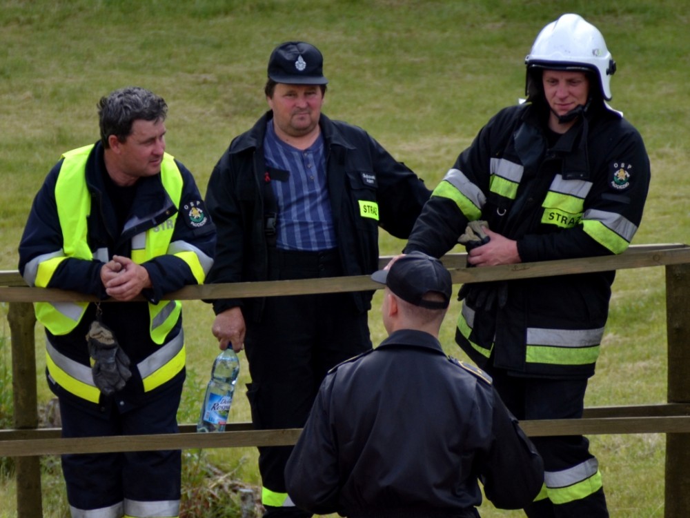 Druhowie zaczynają składać rusztowanie z dwóch drabin i obwiązują je linami. Kilka metrów dalej organizatorzy manewrów ustawili przykładową konstrukcję. Po chwili podobna stoi już nad studnią. Ktoś przypomina o aparacie tlenowym. Ktoś pokazuje jak mocno zawiązać sznur. Podpięty strażak znika między kręgami.