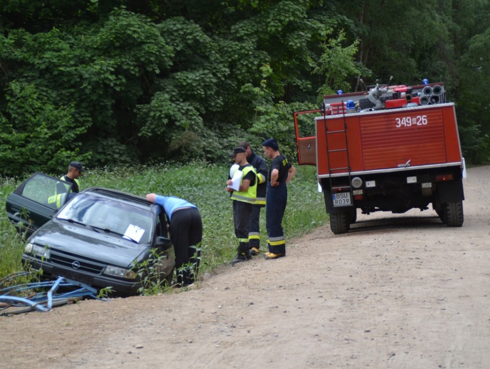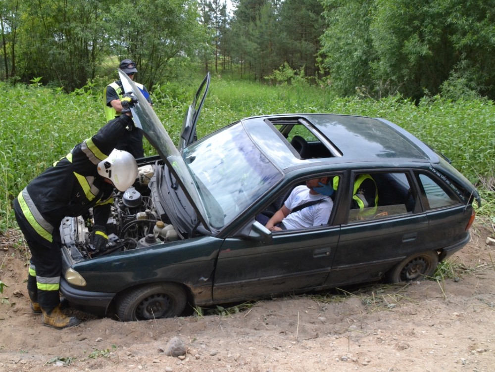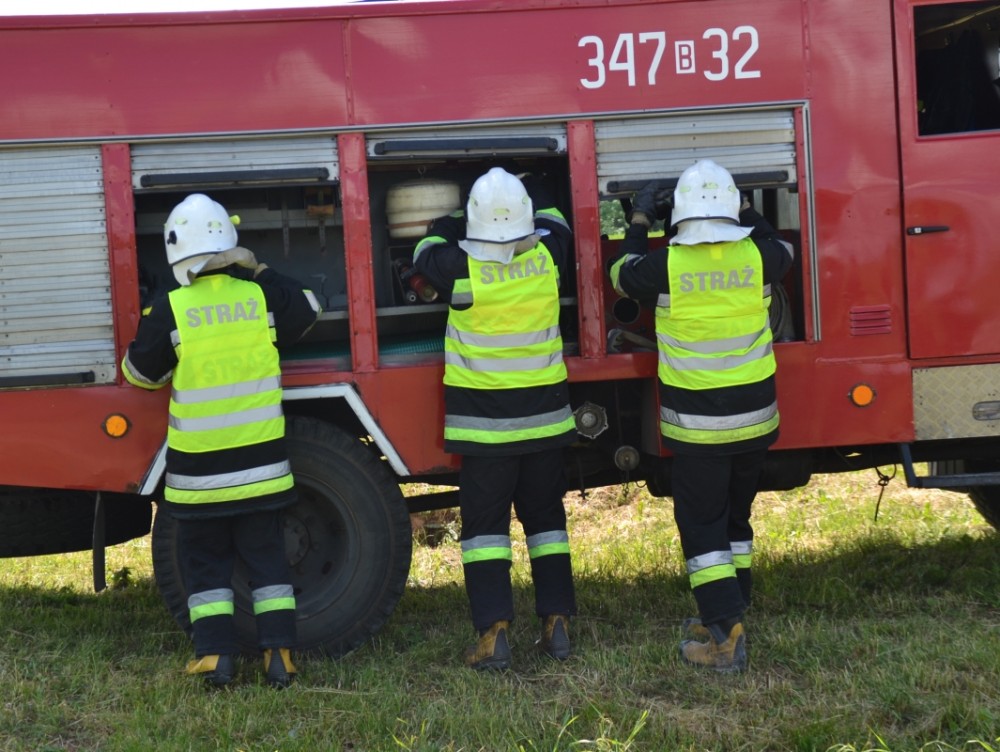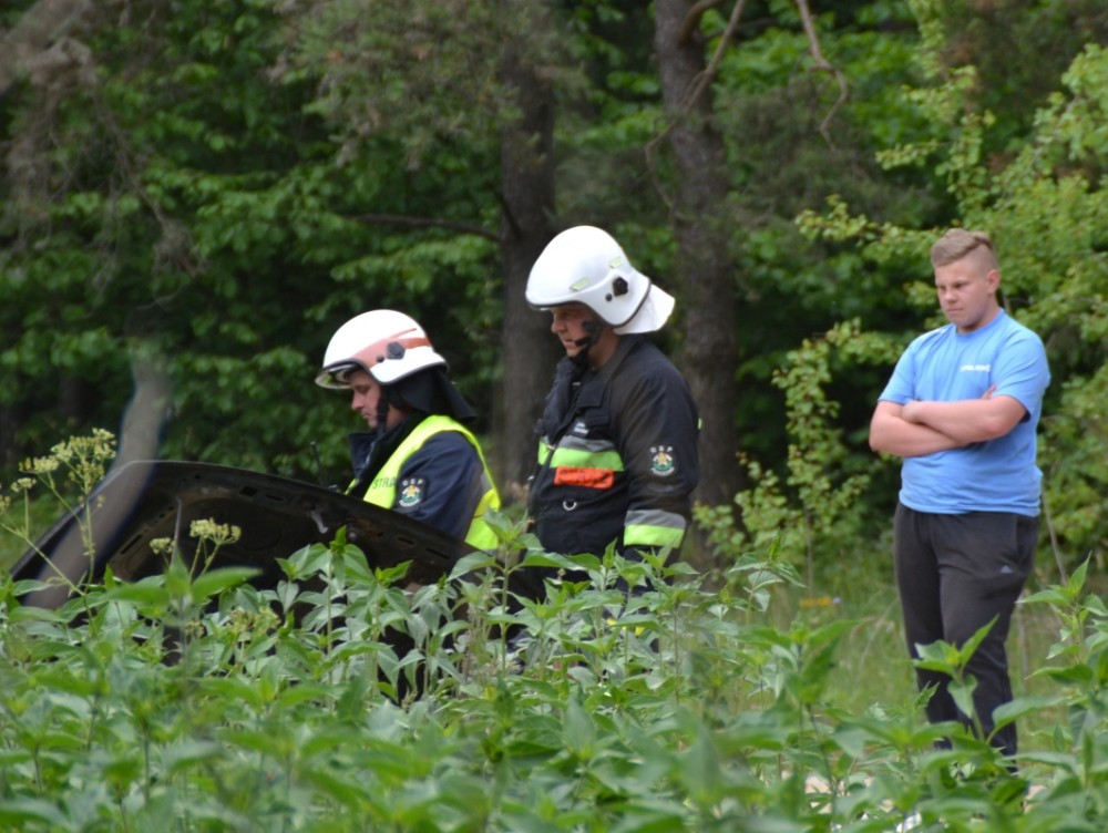 Ostatni z punktów to czysto techniczne rozwinięcie linii gaśniczej. Wcześniej strażacy trafiają na wypadek. Na zjeździe do Krzywólki do rowu wpadł opel. Pasażer wysiadł o własnych siłach, ale kierowca został zakleszczony w samochodzie.