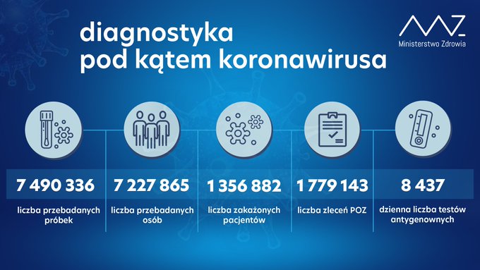 Łącznie od początku wybuchu pandemii w Polsce zakażonych zostało 1 356 882 osób. Zmarło 30 241.