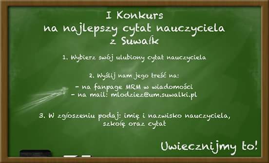 ZgÅ‚oszenia cytatów - utrwalonych "powiedzonek" lub sÅ‚ynnych sÅ‚ów nauczycieli wraz z imieniem i nazwiskiem oraz szkołą nauczyciela należy przesÅ‚ać na adres mailowy: mlodziez@um.suwalki.pl lub na fanpage MÅ‚odzieżowej Rady Miasta SuwaÅ‚ki na Facebook'u w wiadomoÅ›ci.