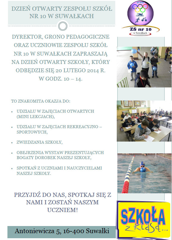 DzieÅ„ otwarty w Zespole Szkól nr 10 w SuwaÅ‚kach, przy ul. Antoniewicza 5 odbÄ™dzie siÄ™ w jutro, czwartek. PoczÄ…tek o 10.00.