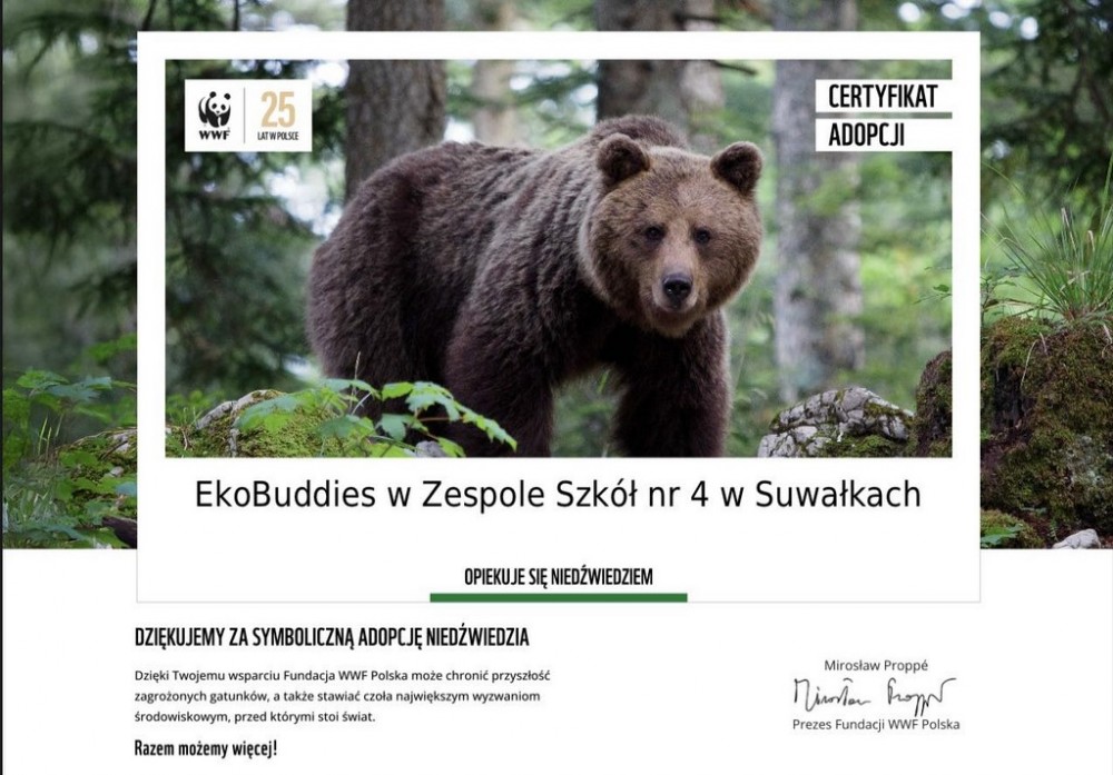 Åšrodki te pozwoliÅ‚y nie tylko na dalszy rozwój projektu, ale także na wsparcie dziaÅ‚aÅ„ zwiÄ…zanych z ochronÄ… zagrożonych gatunków. W ramach projektu uczniowie dokonali adopcji foki szarej oraz niedźwiedzia brunatnego, wspóÅ‚pracujÄ…c z WWF Polska. To niezwykle wzruszajÄ…cy gest, który stanowi nie tylko symbol troski o planetÄ™, ale również realnÄ… pomoc dla ochrony Å›rodowiska i ratowania zagrożonych gatunków.