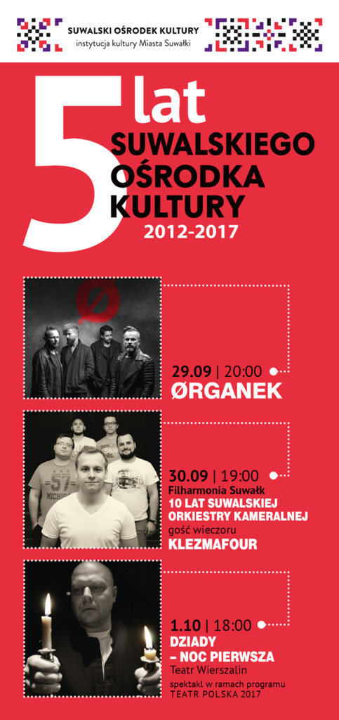 Z okazji 5-lecia Suwalski Ośrodek Kultury zaprasza w sobotę i niedzielę 30.09-1.10.2017 roku nie tylko na zapowiadane wcześniej wydarzenia, ale także na otwarte drzwi pracowni. W programie zajęcia plastyczne, teatralne, muzyczne i taneczne z instruktorami Suwalskiego Ośrodka Kultury.