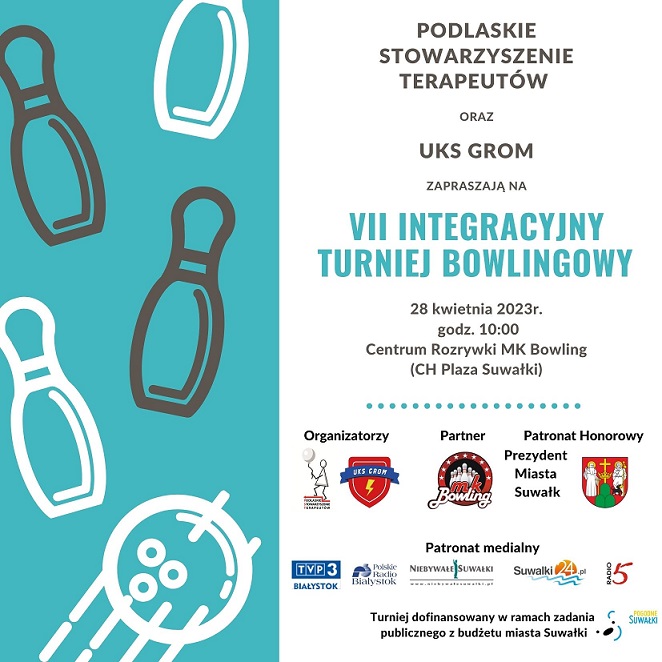 28 kwietnia w godz. 10:00-14:00 w MK Bowling w CH Plaza w Suwałkach odbędzie się VII Integracyjny Turniej Bowlingowy organizowany przez Podlaskie Stowarzyszenie Terapeutów oraz Uczniowski Klub Sportowy GROM.
