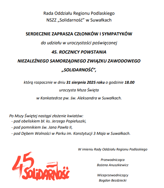 Rada Oddziału Regionu Podlaskiego NSZZ „Solidarność” w Suwałkach serdecznie zaprasza członków i sympatyków do udziału w uroczystości poświęconej 45. rocznicy powstania Niezależnego Samorządnego Związku Zawodowego „Solidarność”.
