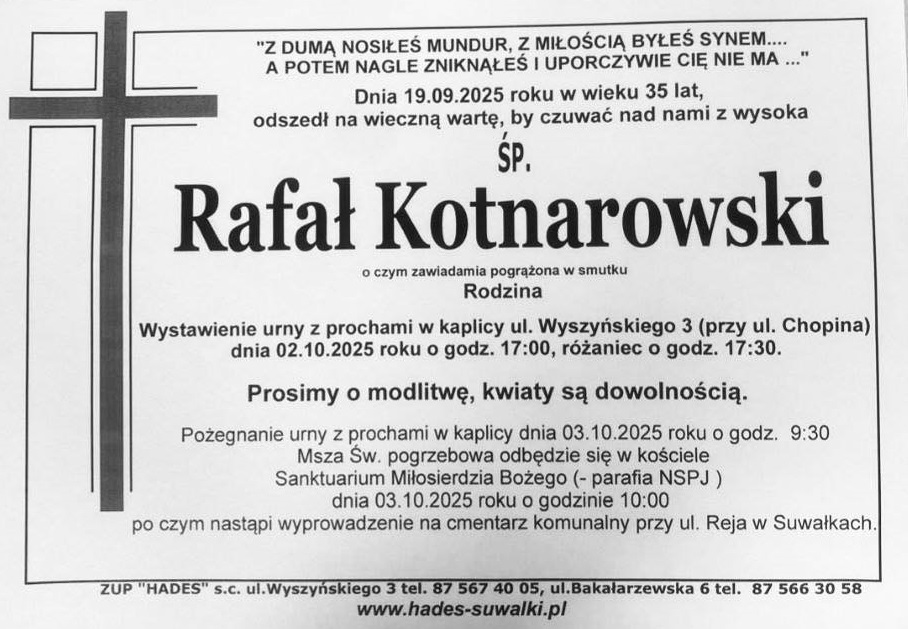 W najbliższy piątek, 3 października o godz. 10:00 w kościele Sanktuarium Miłosierdzia Bożego Suwałkach, rozpocznie się Msza św. pogrzebowa Rafała Kotnarowskiego, żołnierza Wojsk Specjalnych, który zginął podczas nocnego szkolenia spadochronowego w USA.
