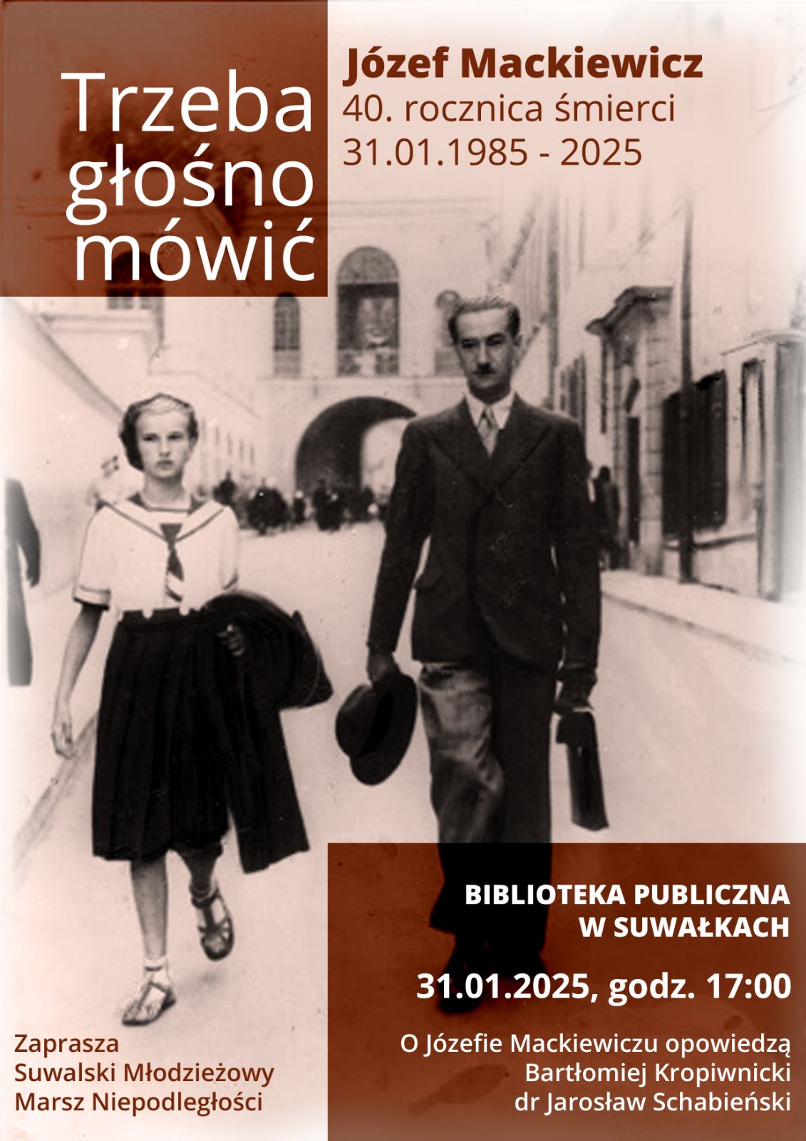 Na zaplanowane na piÄ…tek, 31 stycznia o godz. 17:00 w Bibliotece Publicznej spotkanie pod hasÅ‚em „Trzeba gÅ‚oÅ›no mówić” zaprasza Suwalski MÅ‚odzieżowy Marsz NiepodlegÅ‚oÅ›ci. Podczas spotkania suwalskiej Bibliotece zostanÄ… przekazane książki autorstwa Józefa Mackiewicza.