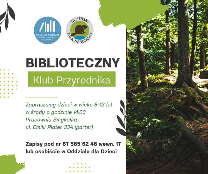 Wigierski Park Narodowy wraz z Biblioteką Publiczną im. Marii Konopnickiej w Suwałkach zachęcają wszystkich młodych pasjonatów przyrody do dołączenia do "Bibliotecznego Klubu Przyrodnika"! Zajęcia odbywają się w środy o godzinie 14:00 w Bibliotece, w Pracowni Smykałka. Jest jeszcze kilka wolnych miejsc.