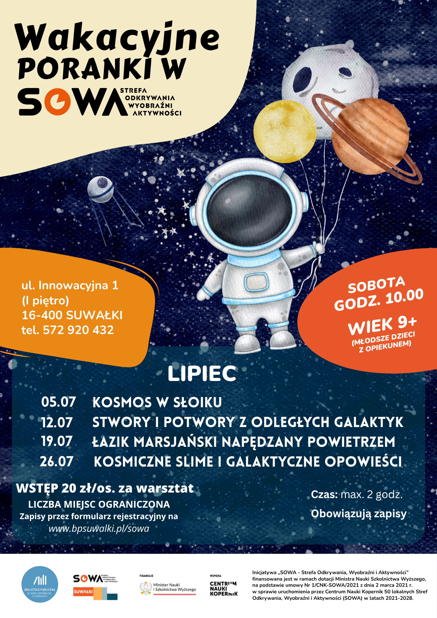 SOWA, czyli Strefa Odkrywania, Wyobraźni i Aktywności w Suwałkach, prowadzona przez Bibliotekę Publiczną im. Marii Konopnickiej zaprasza wszystkie młode umysły na kreatywne, pełne przygód warsztaty o tematyce kosmicznej!