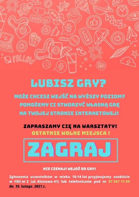 ZgÅ‚oszenia uczestników w wieku 10-14 lat przyjmowane sÄ… osobiÅ›cie w Filii nr 2 Biblioteki Publicznej im. Marii Konopnickiej w SuwaÅ‚kach (ul. Klonowa 41) lub telefonicznie pod nr 87 567 11 09 do 10 lutego 2021 r.
