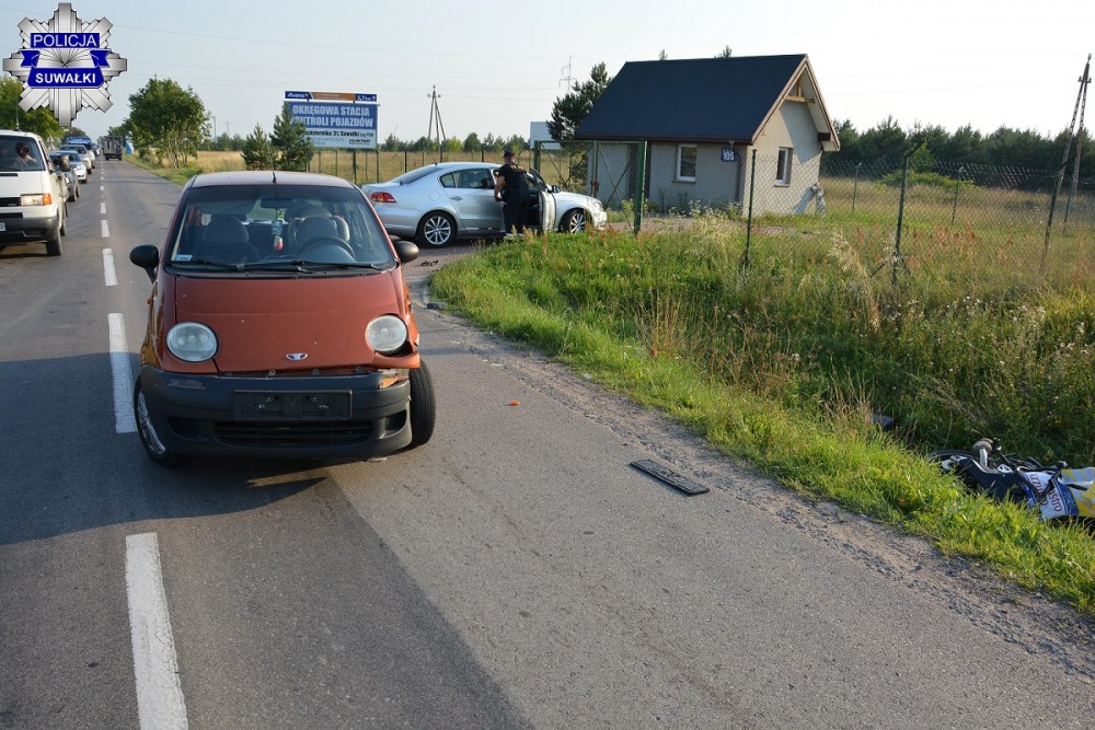 W czwartek na ul. Reja w Suwałkach doszło do zderzenia motocyklisty z Matizem. 21-latek kierujący jednośladem z obrażeniami ciała trafił do szpitala. Suwalscy policjanci wyjaśniają szczegóły i okoliczności zdarzenia.