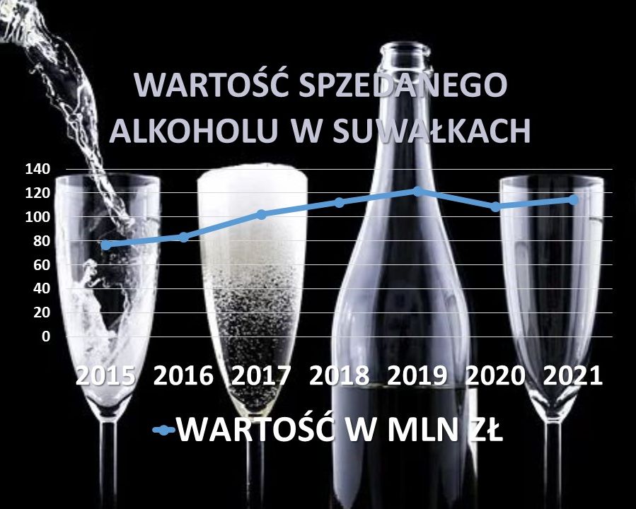 OgóÅ‚em wartość sprzedaży napojów alkoholowych na terenie miasta SuwaÅ‚k w 2021 r. wyniosÅ‚a 114.437.294,32 zÅ‚ i byÅ‚a wyższa o 5.948.291,88 zÅ‚ w porównaniu do roku 2020. Przy czym w punktach detalicznych wartość sprzedaży napojów alkoholowych wzrosÅ‚a o 4.034.074,27 zÅ‚, natomiast w punktach gastronomicznych o 1.914.217,61 zÅ‚.