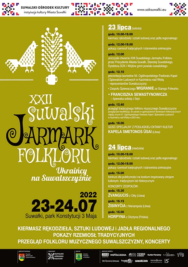 Suwalski Ośrodek Kultury zaprasza na XXII Jarmark Folkloru, który w tym roku odbędzie się pod hasłem „Ukraińcy na Suwalszczyźnie”. W programie koncerty, przegląd folkloru muzycznego regionu oraz folkowy kiermasz z lokalnymi wyrobami, na który zapraszamy wystawców i rękodzielników.