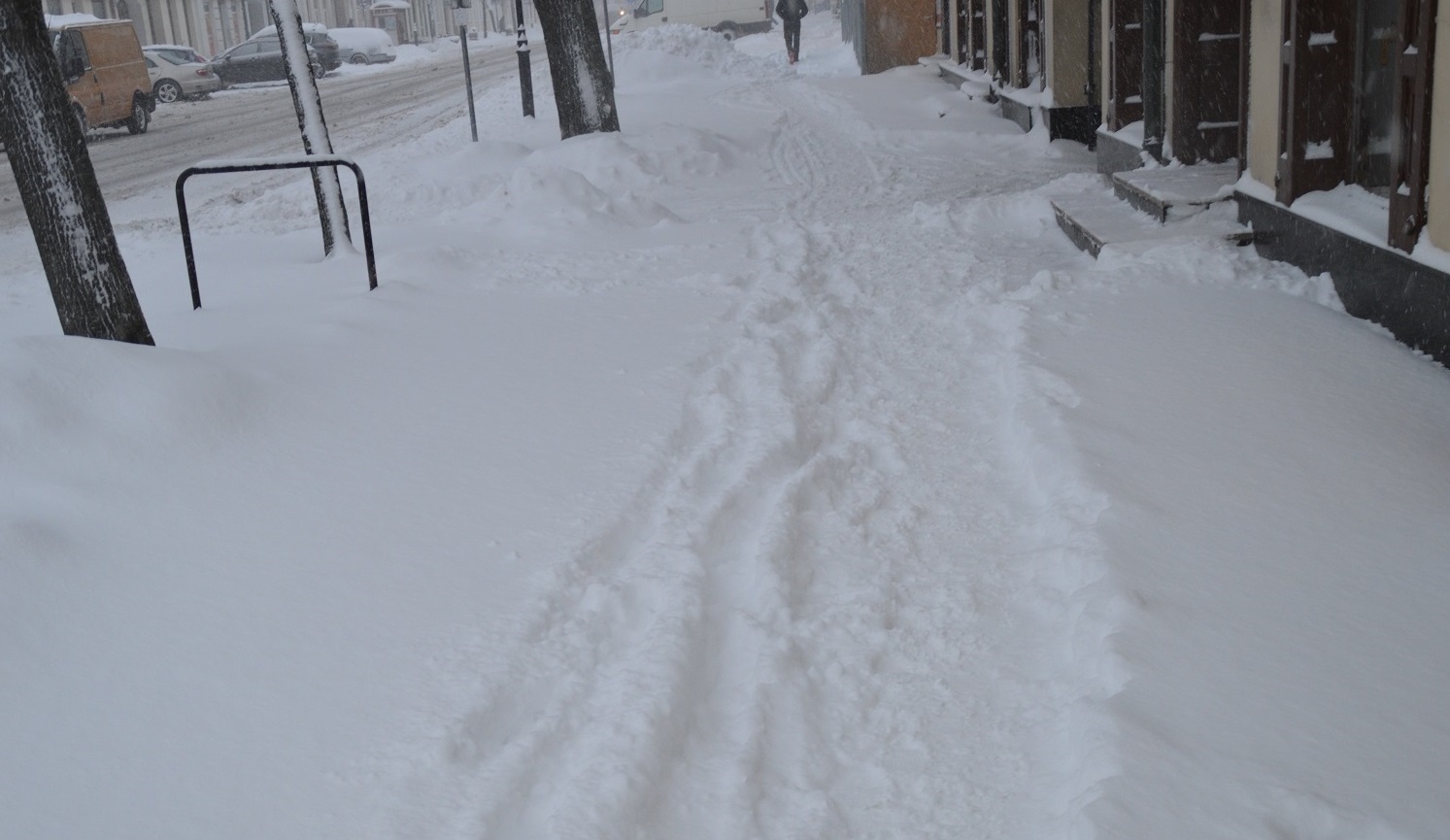 Stan nawierzchni chodników – luźny Å›nieg, odÅ›nieżanie w trakcie.