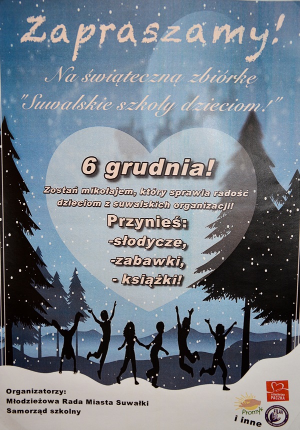 - MÅ‚odzieżowa Rada Miasta SuwaÅ‚ki dopiero zaczyna dziaÅ‚ać, dlatego chcemy udowodnić, że decyzja o jej utworzeniu byÅ‚a "strzaÅ‚em w dziesiÄ…tkÄ™". Podczas konsultacji i rozmów z uczniami dowiadujemy siÄ™, jakie sÄ… ich potrzeby. StÄ…d pomysÅ‚ na zbiórkÄ™ 6 grudnia. To idealny przykÅ‚ad na to, że pomiÄ™dzy suwalskimi szkoÅ‚ami nad rywalizacjÄ… dominuje wzajemna wspóÅ‚praca – przekonuje P. Wasilewski.