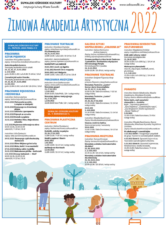 Zajęcia rozpoczynają się 24 stycznia i potrwają do 5 lutego 2022 roku. Na warsztaty obowiązują zapisy. Szczegółowe informacje dotyczące Zimowej Akademii Artystycznej znajdują się na stronie Suwalskiego Ośrodka Kultury.