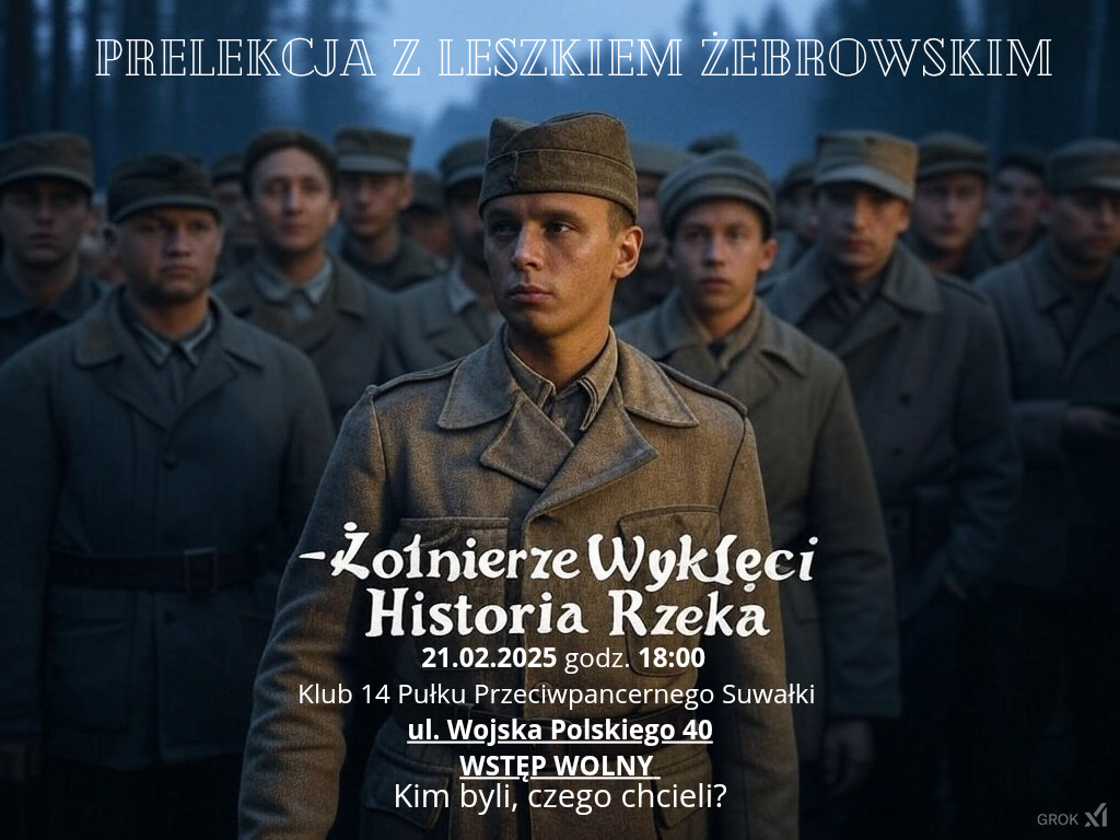 W najbliższy piątek, 21 lutego o godz. 18:00 w Klubie 14 Pułku Przeciwpancernego w przy ul. Wojska Polskiego 40 Suwałkach rozpocznie się spotkanie z historykiem Leszkiem Żebrowskim, organizowane przez suwalskich działaczy Ruchu Narodowego Konfederacji .