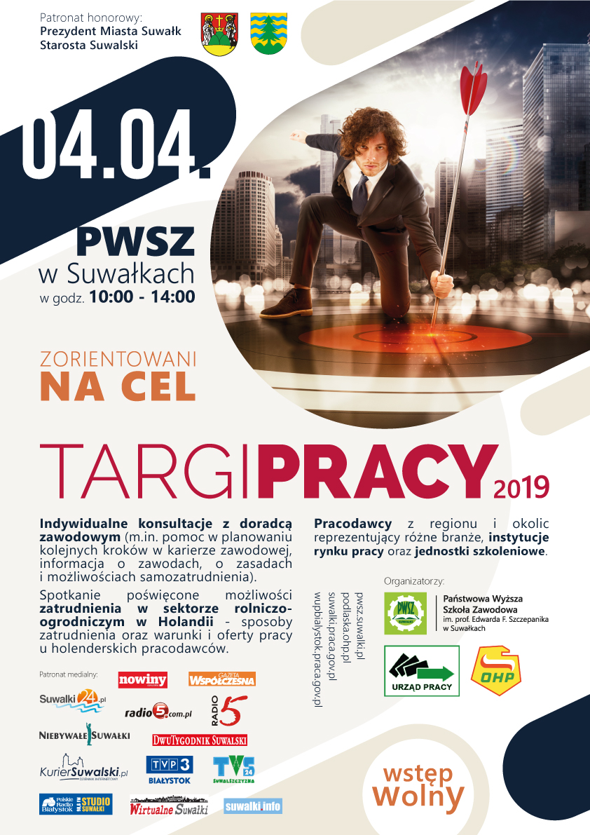 Państwowa Wyższa Szkoła Zawodowa im. prof. Edwarda F. Szczepanika w Suwałkach, Wojewódzki Urząd Pracy w Białymstoku Oddział Terenowy w Suwałkach, Powiatowy Urząd Pracy w Suwałkach oraz Centrum Edukacji i Pracy Młodzieży w Suwałkach serdecznie zapraszają do udziału w Targach Pracy, które odbędą się 4 kwietnia w Państwowej Wyższej Szkole Zawodowej w Suwałkach, przy ul. Noniewicza 10.