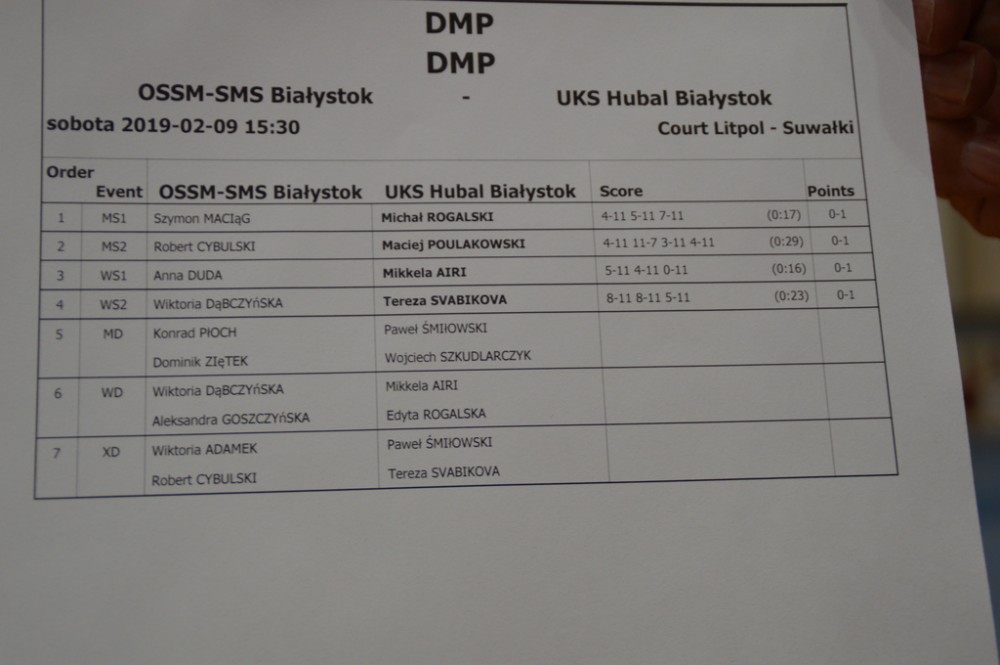 Kibice w hali OSiR byli pełni nadziei, że SKB Litpol-Malow sięgnie po 18. już tytuł, bo po grach pojedynczych mężczyzn gospodarze prowadzili 2:0. Suwalski Duńczyk Emil Holst w niespełna kwadrans uporał się z Miłoszem Kaimem, a w stojącym na dobrym poziomie pojedynku dwóch kadrowiczów Mateusz Świerczyński pokonał Mateusza Dubowskiego, wicemistrza kraju.
