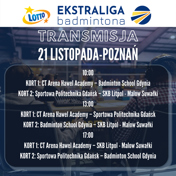 g. 17:00 – SKB Litpol-Malow Suwałki - CT Arena Hawel Academy i Sportowa Politechnika Gdańsk - Badminton School Gdynia
