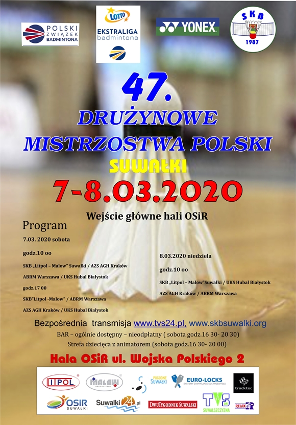 - Przed sobotnio-niedzielnym turniejem piątej rundy ekstraklasy w Suwałkach zajmujemy w tabeli drugie miejsce, ale podobnie jak trzeci Hubal, do lidera ABRM tracimy tylko jeden punkt. Mamy zatem dużą szansę na to, żeby do finału przystąpić z pozycji lidera. Warunkiem jest pokonanie ekip ze stolic kraju i województwa – mówi Jerzy Szleszyński, prezes SKB Litpol-Malow. – Wystąpimy w najsilniejszym składzie. Liczymy też na gorący doping naszych kibiców, który doda skrzydeł naszym badmintonistom. Od 21 lat gramy w finale Drużynowych Mistrzostw Polski i nie wyobrażam sobie, żebyśmy nie wystąpili w finale i nie walczyli o złoto także w roku 2020.