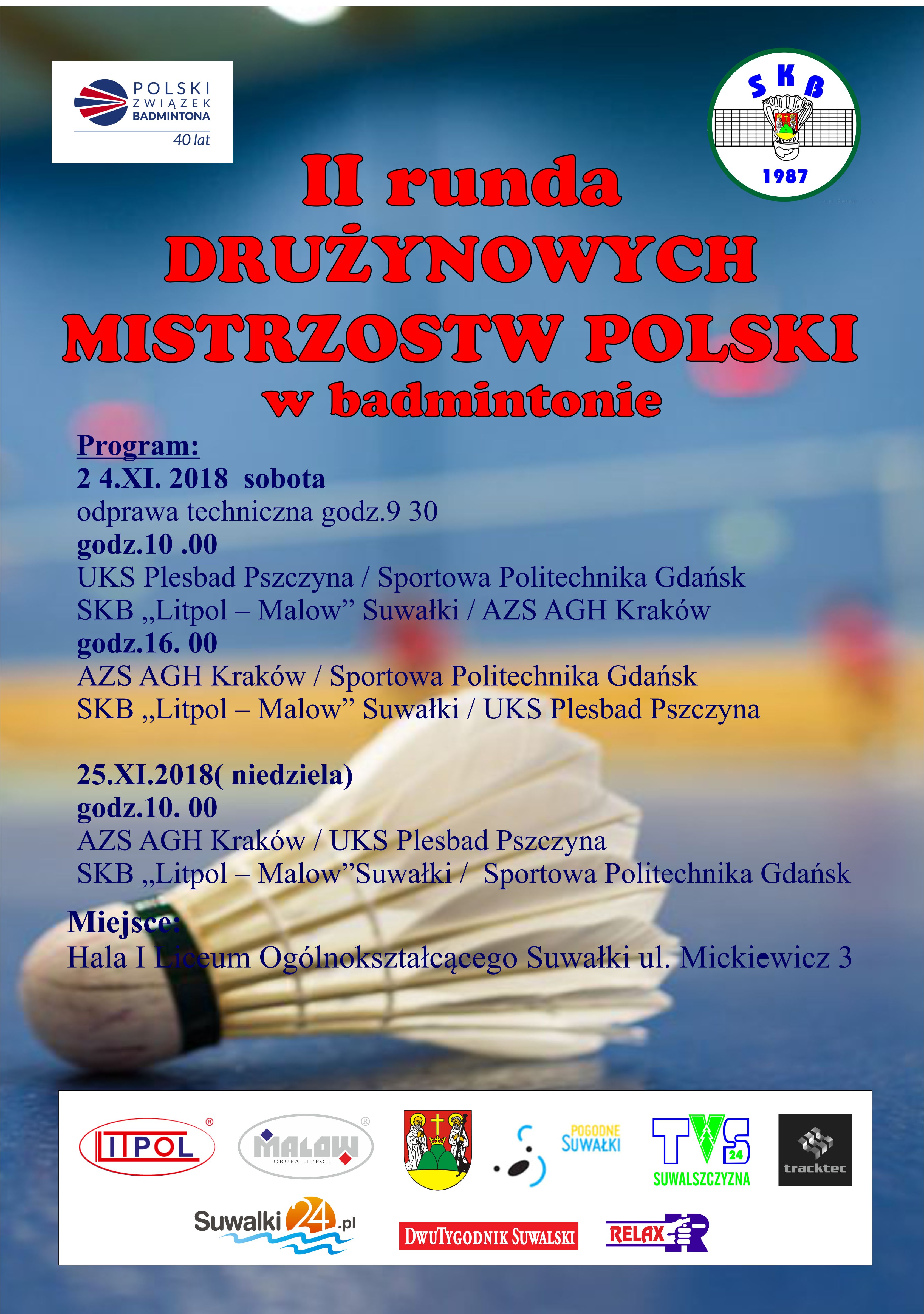 Równlegle z meczami w Suwałkach turnieje II rundy ekstraklasy badmintona rozegrane zostaną w Warszawie (hitem będzie mecz wicemistrzów kraju Hubala Białystok z gospodarzami turnieju Akademią Badmintona Roberta Mateusiaka) oraz w Głubczycach i Nowej Dębie.