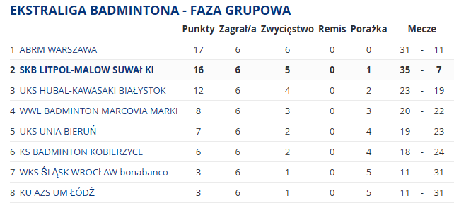 Mistrz Polski, SKB Litpol Malow Suwałki po zaciętym meczu przegrał z wicemistrzem, Akademią Badmintona Roberta Mateusiaka Warszawa 3:4.