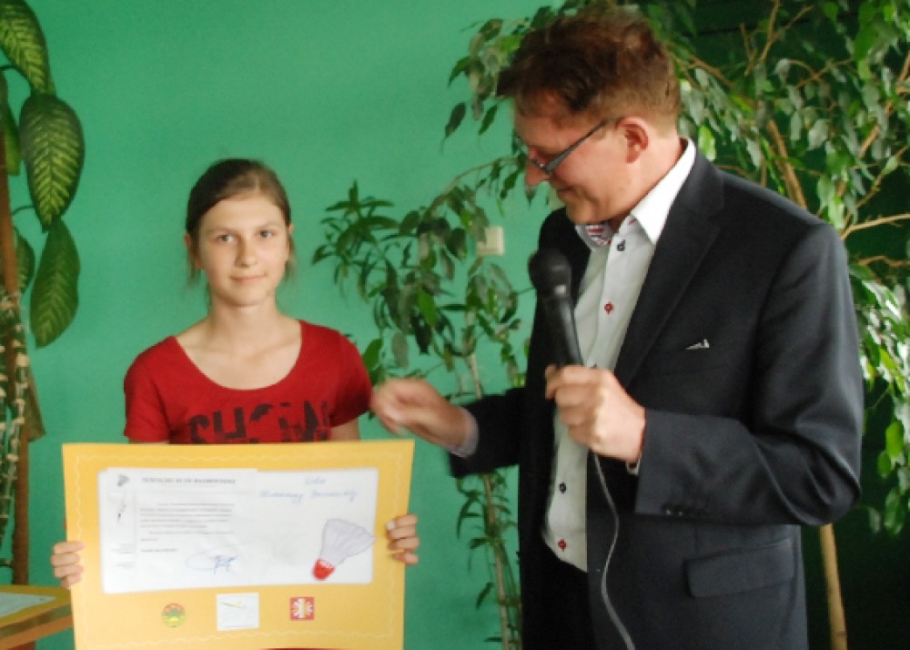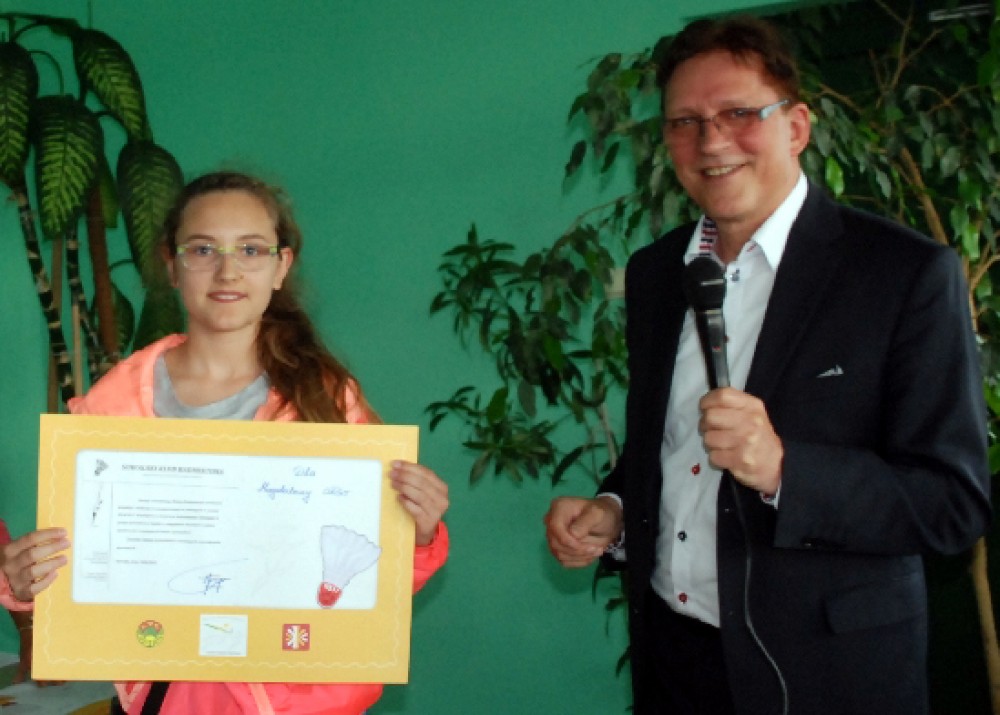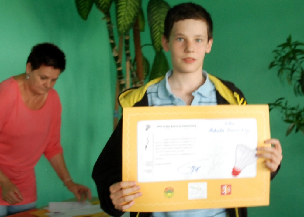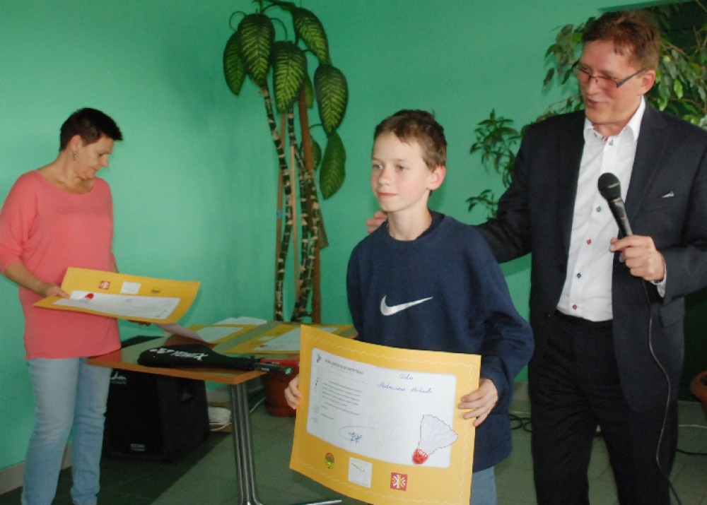 Najbardziej zaangażowani mÅ‚odzi zawodnicy odebrali dyplomy, a brÄ…zowi medaliÅ›ci w deblu mÅ‚odzików mÅ‚odszych nagrody rzeczowe w postaci rakiet do gry w badmintona.