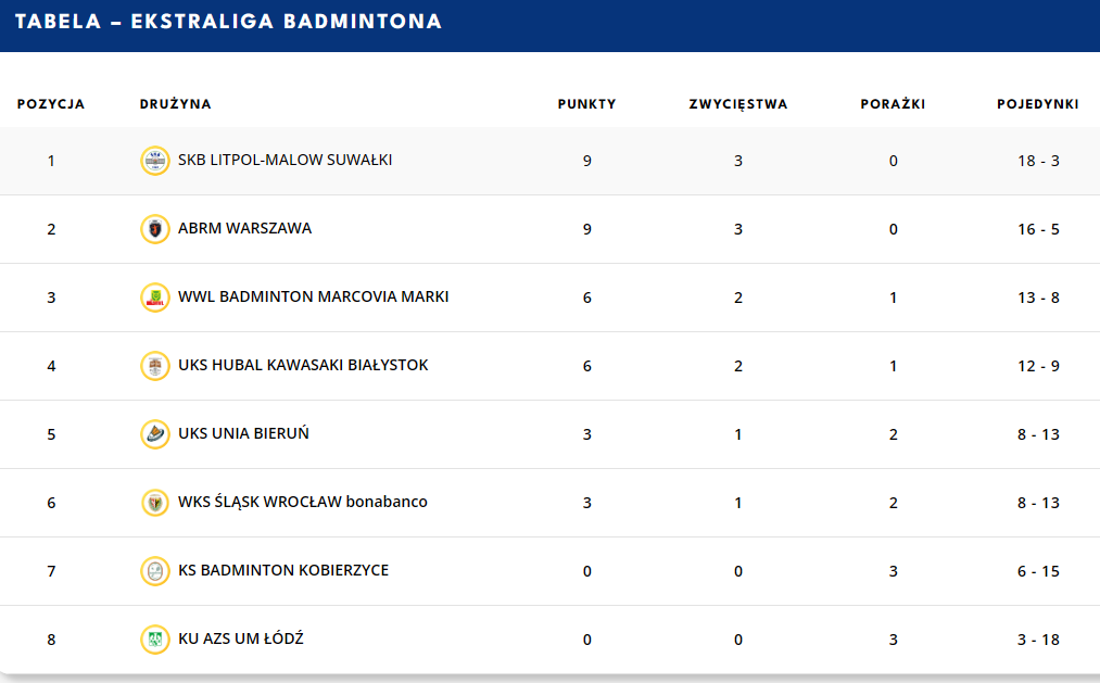Po trzech kolejkach spotkań liderem, z kompletem trzech zwycięstw za 3 punkty, jest broniący tytułu SKB Litpol Malow Suwałki. Drużyna trenera Jerzego Dołhana kolejno wygrała z Unią Bieruń 6:1, WWL Badminton Marcovią Marki 5:2 i z KU AZS UM Łódź 7:0.