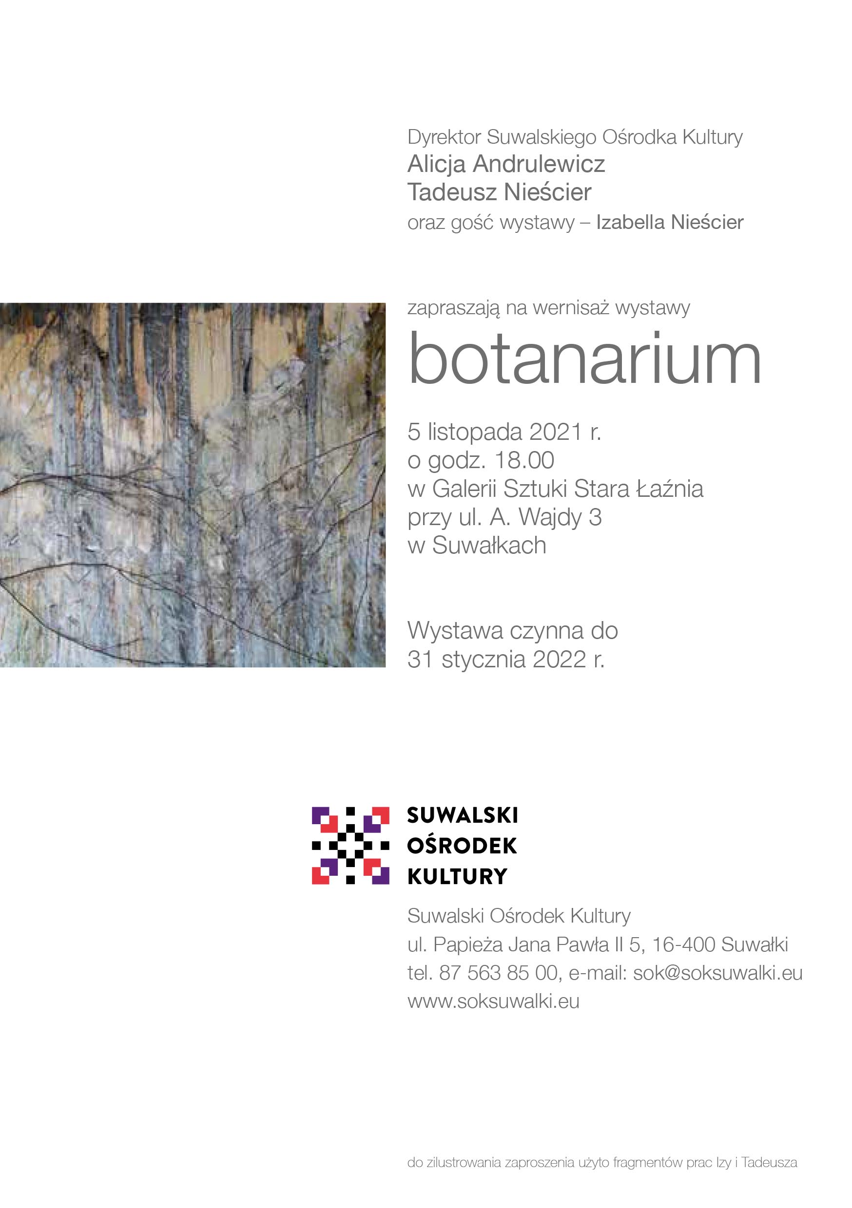 Wystawa będzie prezentowana w Galerii Sztuki Stara Łaźnia Suwalskiego Ośrodka Kultury przy ul. A. Wajdy 3 od 5 listopada br. do 31 stycznia 2022 roku. Wstęp wolny. Wystawie towarzyszy bogato ilustrowany drukowany katalog.