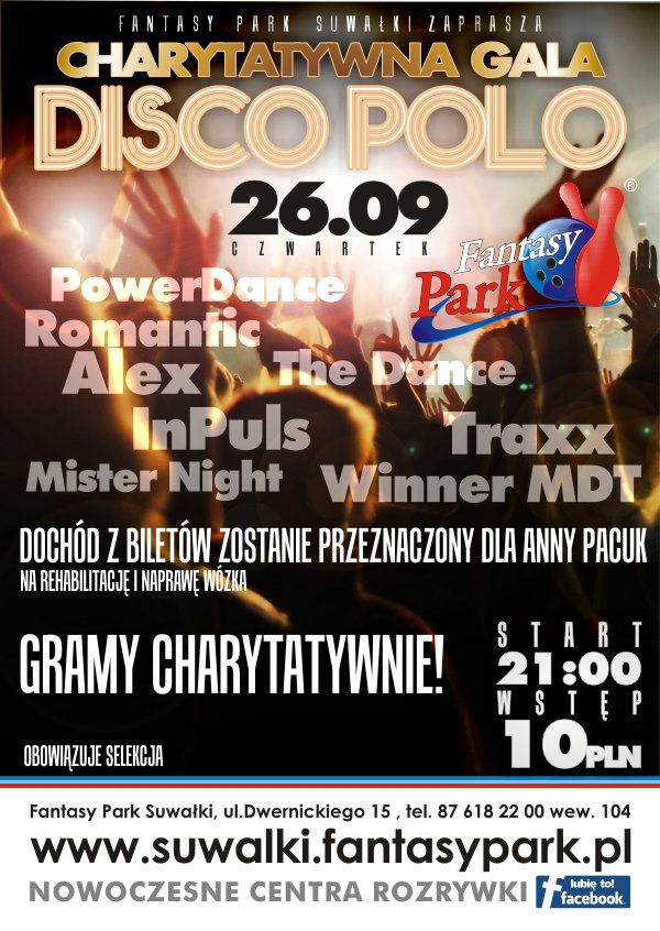 Zapraszamy gorąco na Charytatywną Galę Disco Polo – we czwartek 26.09. Start o godzinie 21:00.
