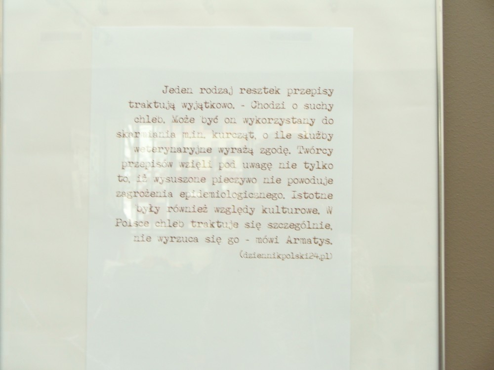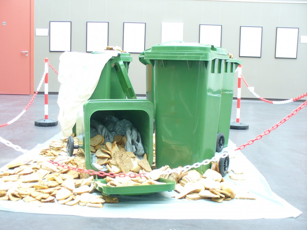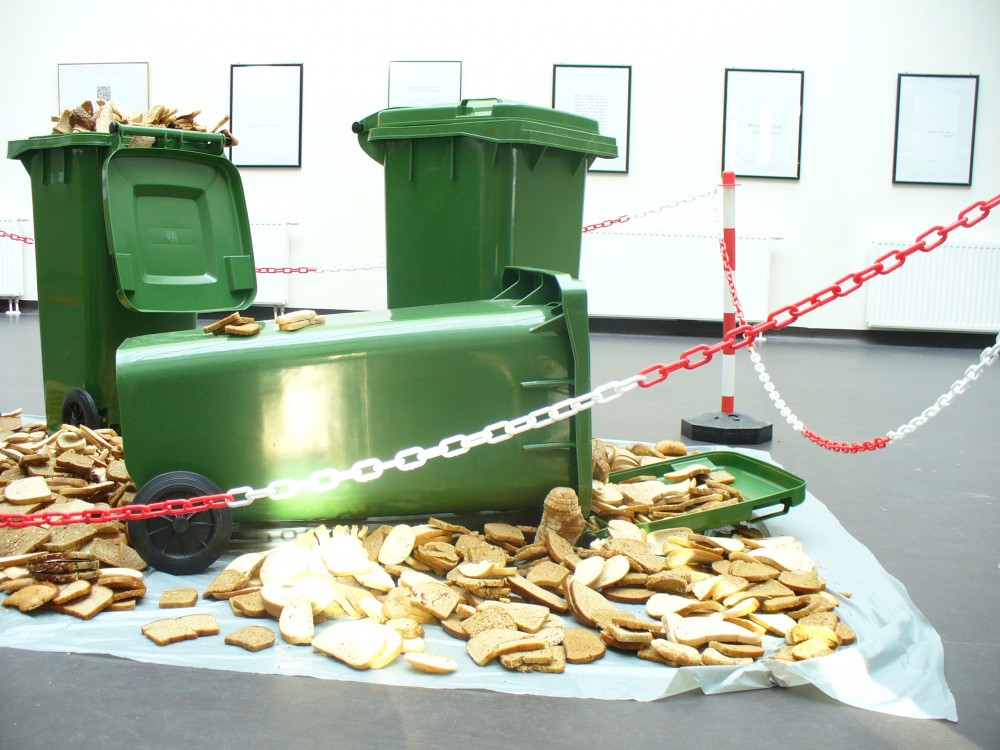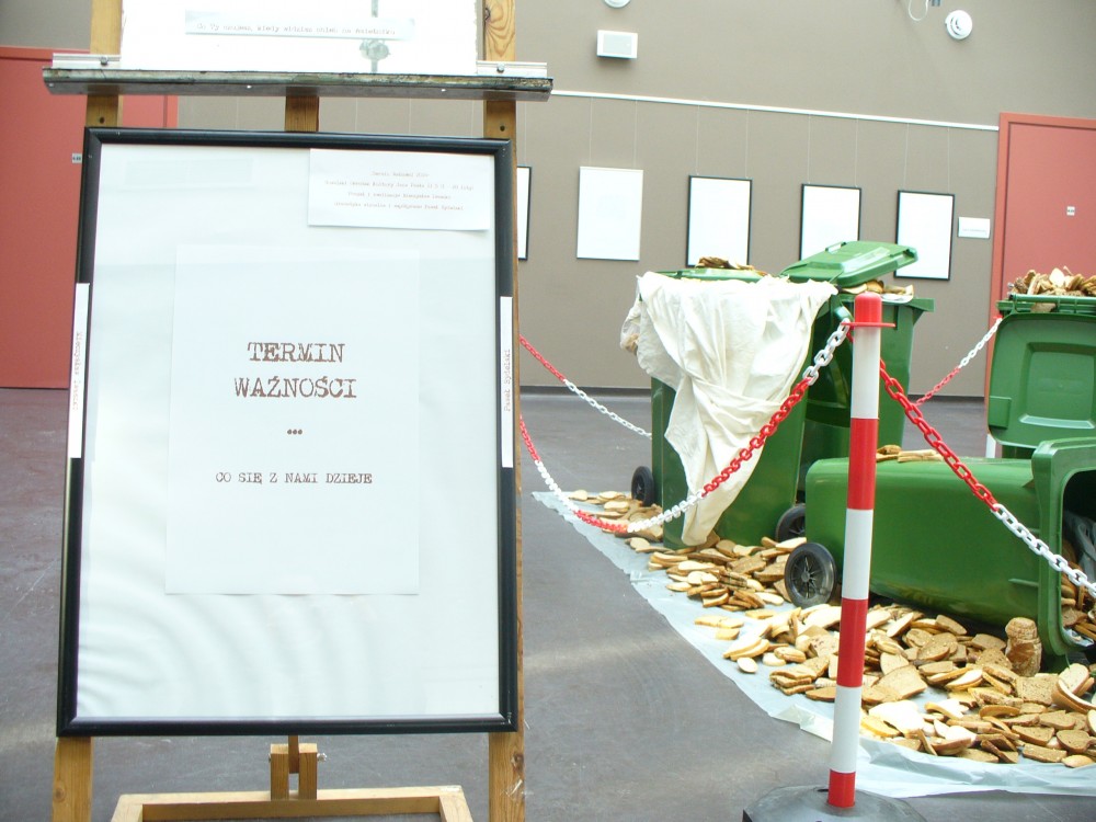 Nad chlebem wyrzucanym na śmietnik pochylił się Mieczysław Iwaszko, prowadzący pracownię sztuk pięknych w Suwalskim Ośrodku Kultury. Wpadł na pomysł, aby to swoje „pochylenie” unaocznić. Może skonfrontować z odbiorcą, wybudzić z konsumpcyjnego snu. Wraz z Pawłem Bydelskim wykonali poruszającą instalację. W patio SOK wypełnili chlebem kosze na śmieci. Porozrzucali chleb na podłodze. Pomysł niby prosty, bo bez skomplikowanej oprawy wizualnej, bez oświetlenia, kabli, jedwabnego sukna, pozłacanych ram, a jednak dotykający do żywego. To tylko kilka kubłów. To „tylko” zwykły chleb. Taki obraz dziwi, szokuje, drażni, denerwuje. Zresztą, swoją minę każdy może zobaczyć sam w stojącym obok lustrze.