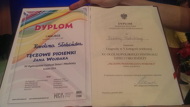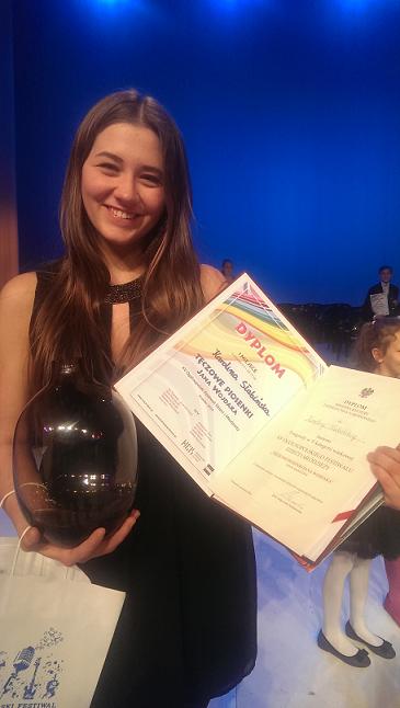 Śpiewająca w suwalskich Beciakach Karolina Słabińska zdobyła pierwsze miejsce w finale Ogólnopolskiego Festiwalu Dzieci i Młodzieży "Tęczowe Piosenki Jana Wojdaka".